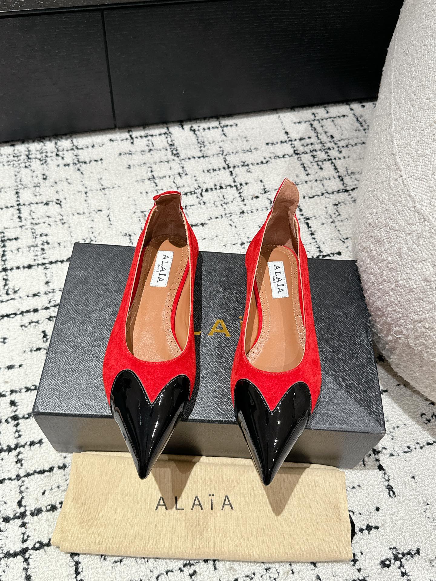 ALAIA PUMP 1 CM IN CHERRY RED SUEDE MIX BLACK CALFSKIN