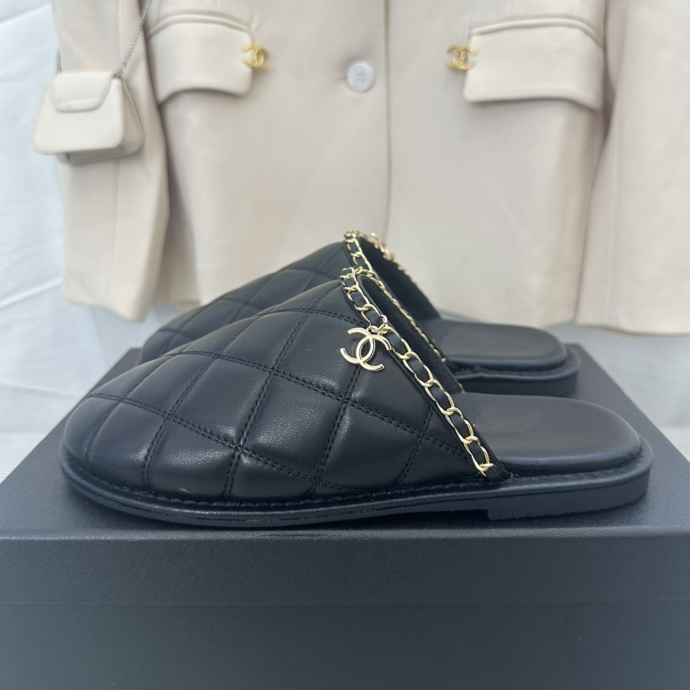 CC Black Lambskin Gold Chain Mules