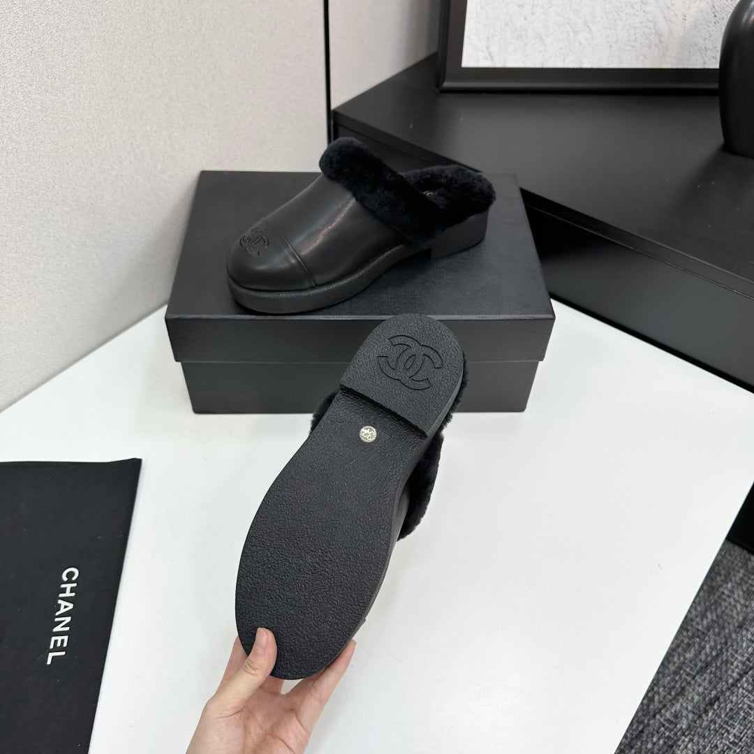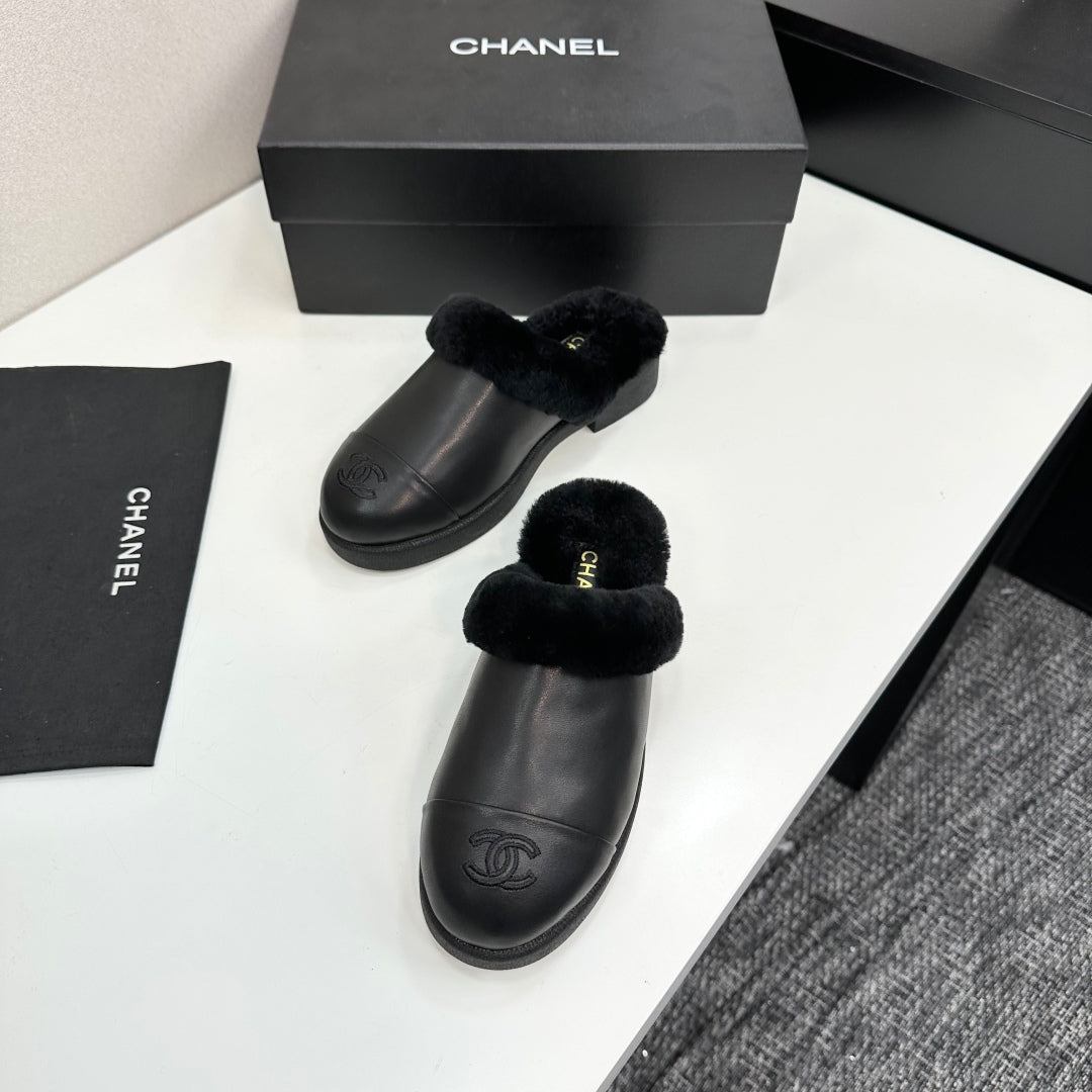 CC FLAT MULE IN BLACK WOOL TWEED AND CALFSKIN GOLD HARDWARE