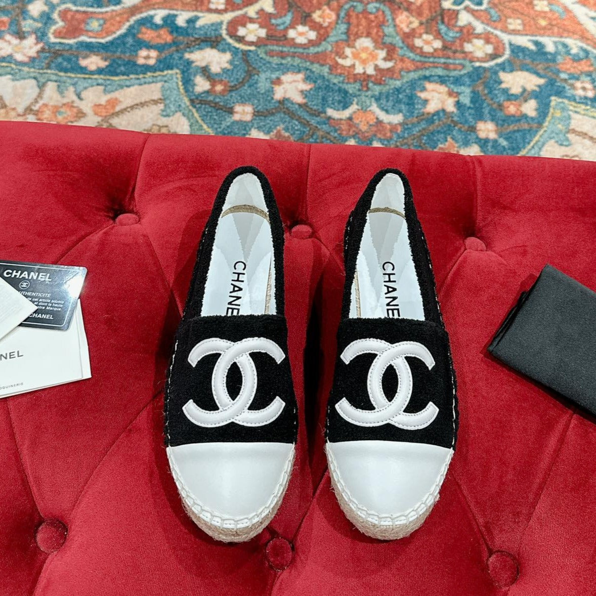 cc espadrilles black white woolen cloth black lambskin