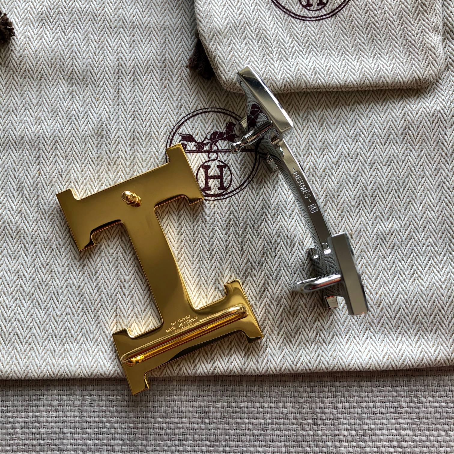 HM BELT BUCKLE & REVERSIBLE BLACK AND BRONZE BROWN LEATHER STRAP 38MM GOLD HARDWARE