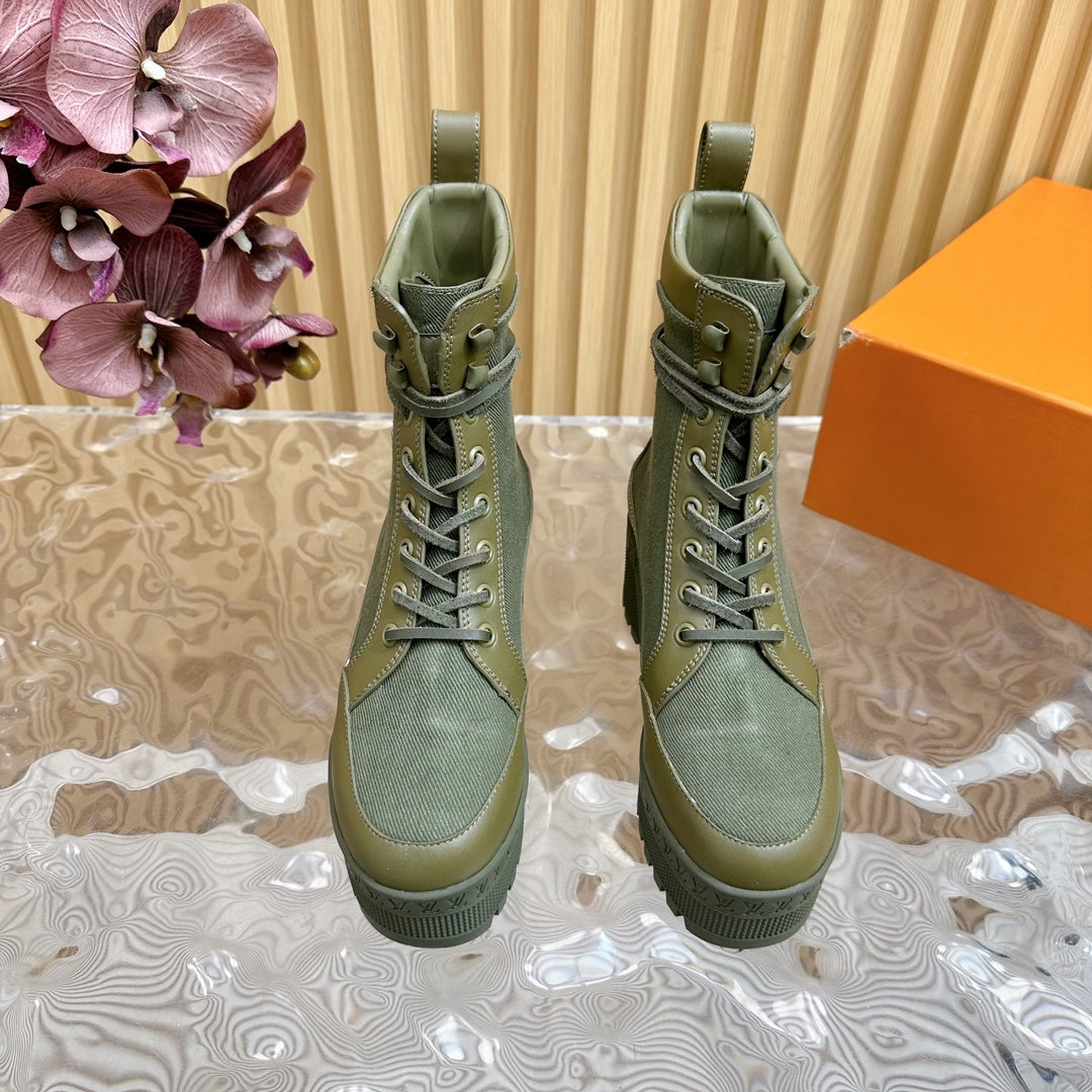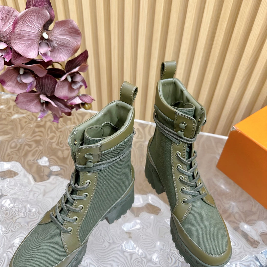 LV Laureate Platform Desert Boot 70mm Khaki Green Denim Fabric