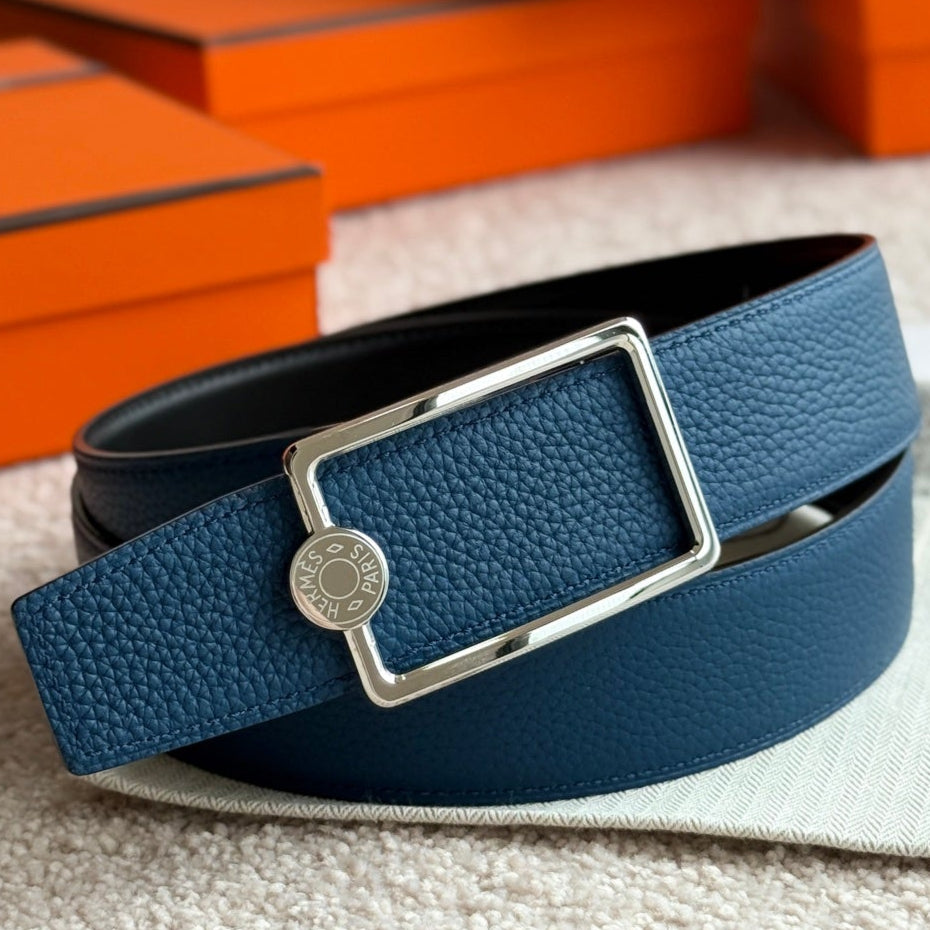 HM Silver Tube H Buckle Belt 38mm Prussian blue Black Leather 187523