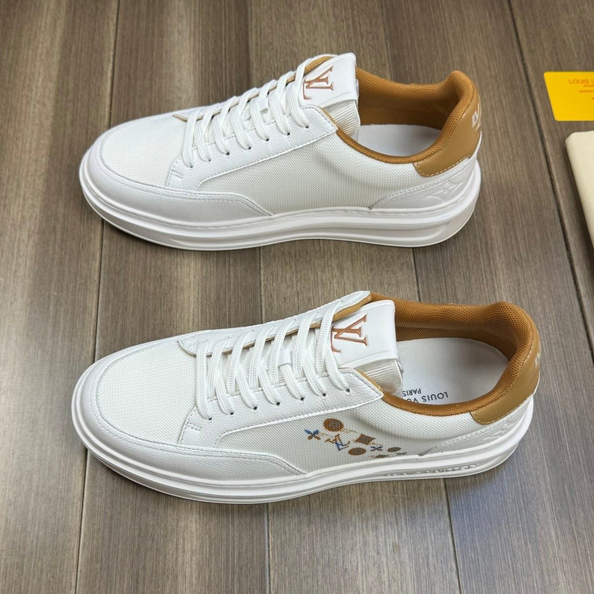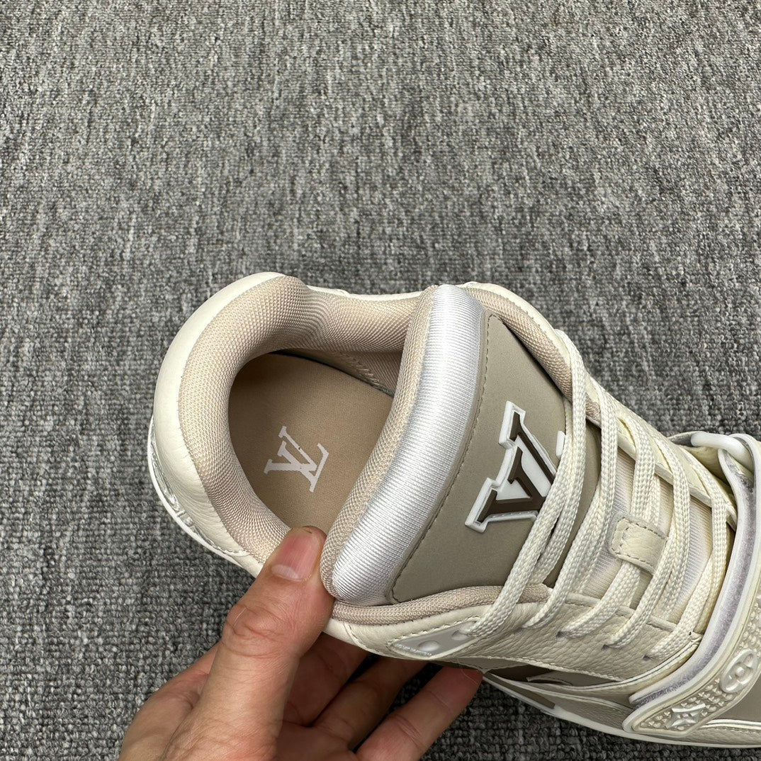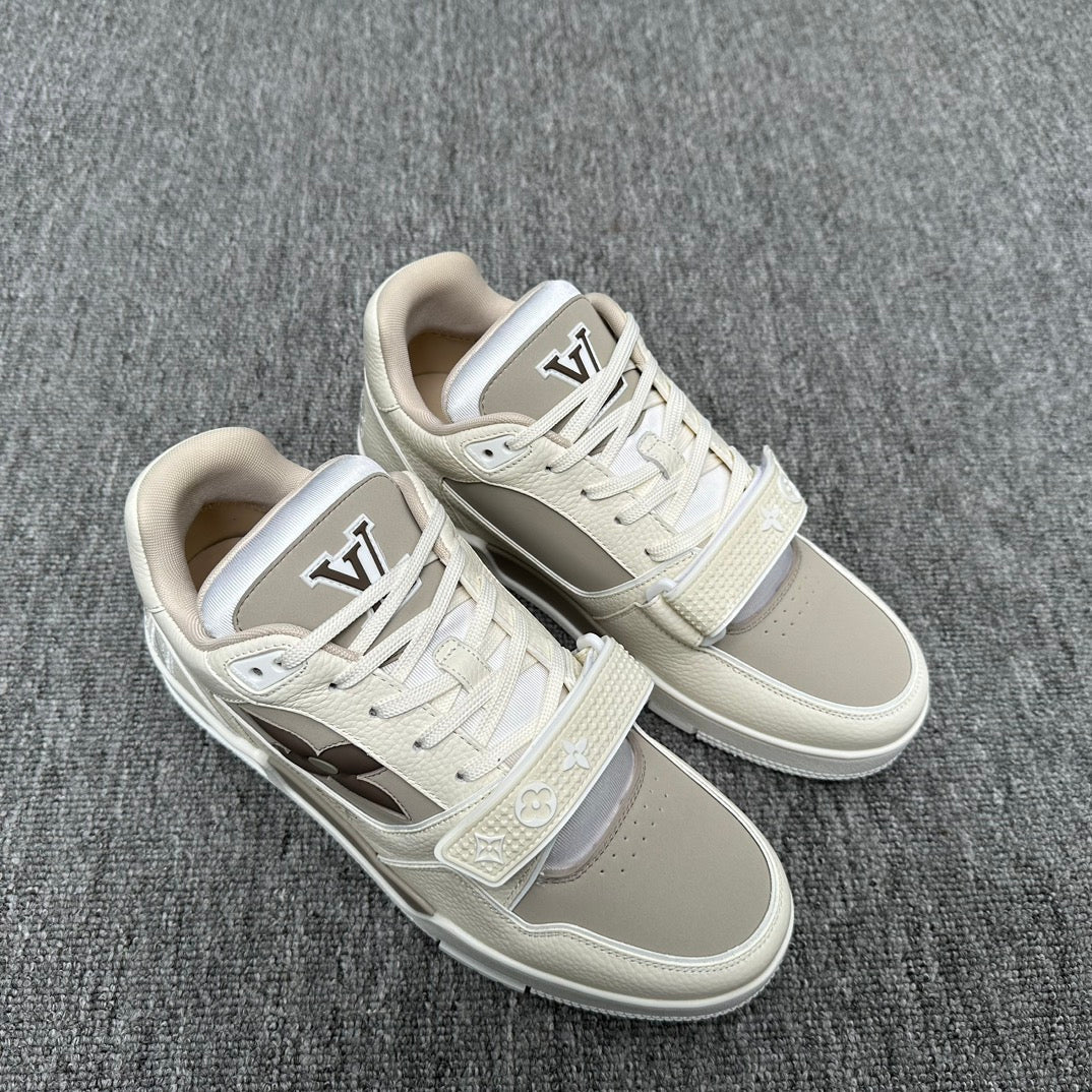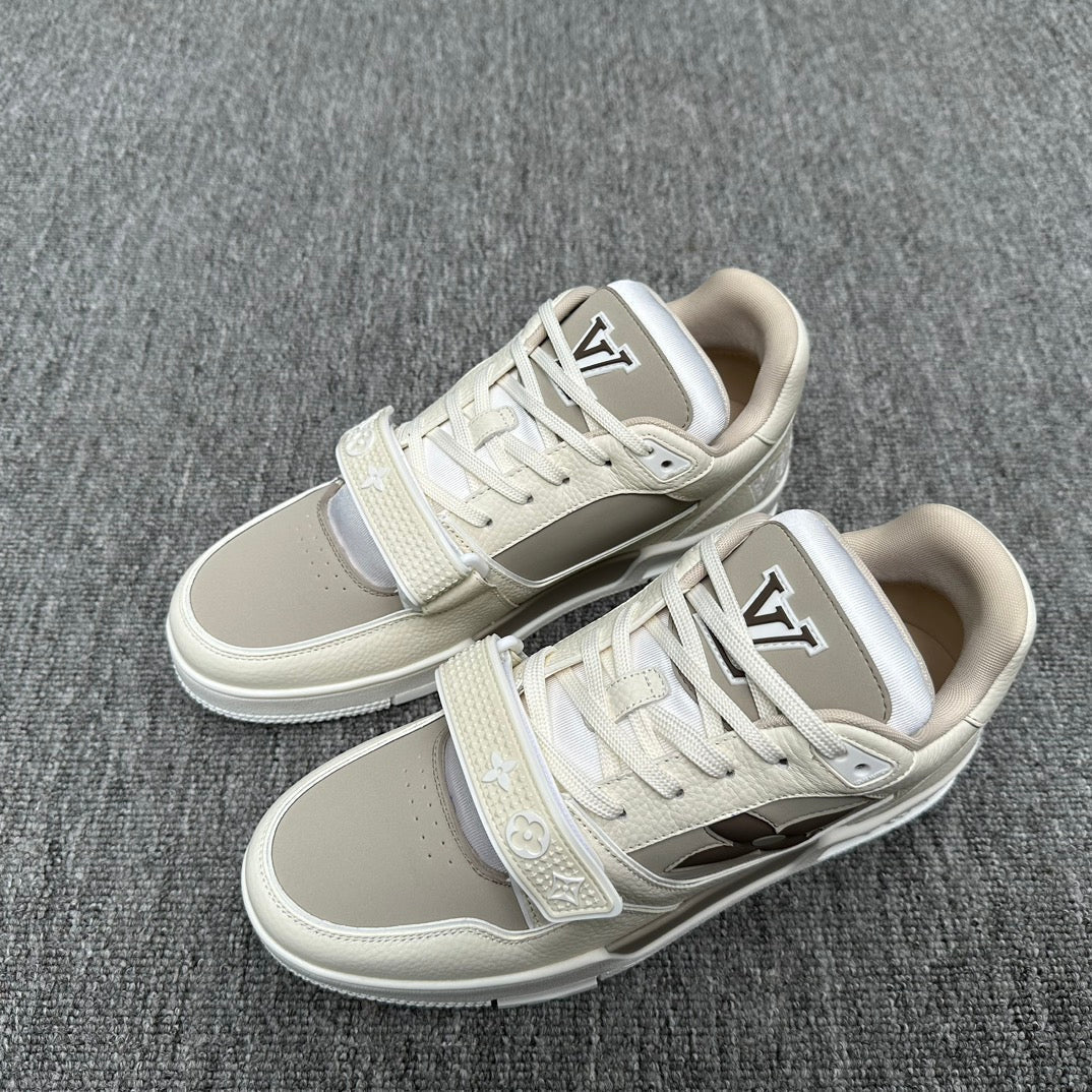 LV TRAINER SNEAKER WHITE CALFSKIN MIX CAMEL BEIGE SUEDE