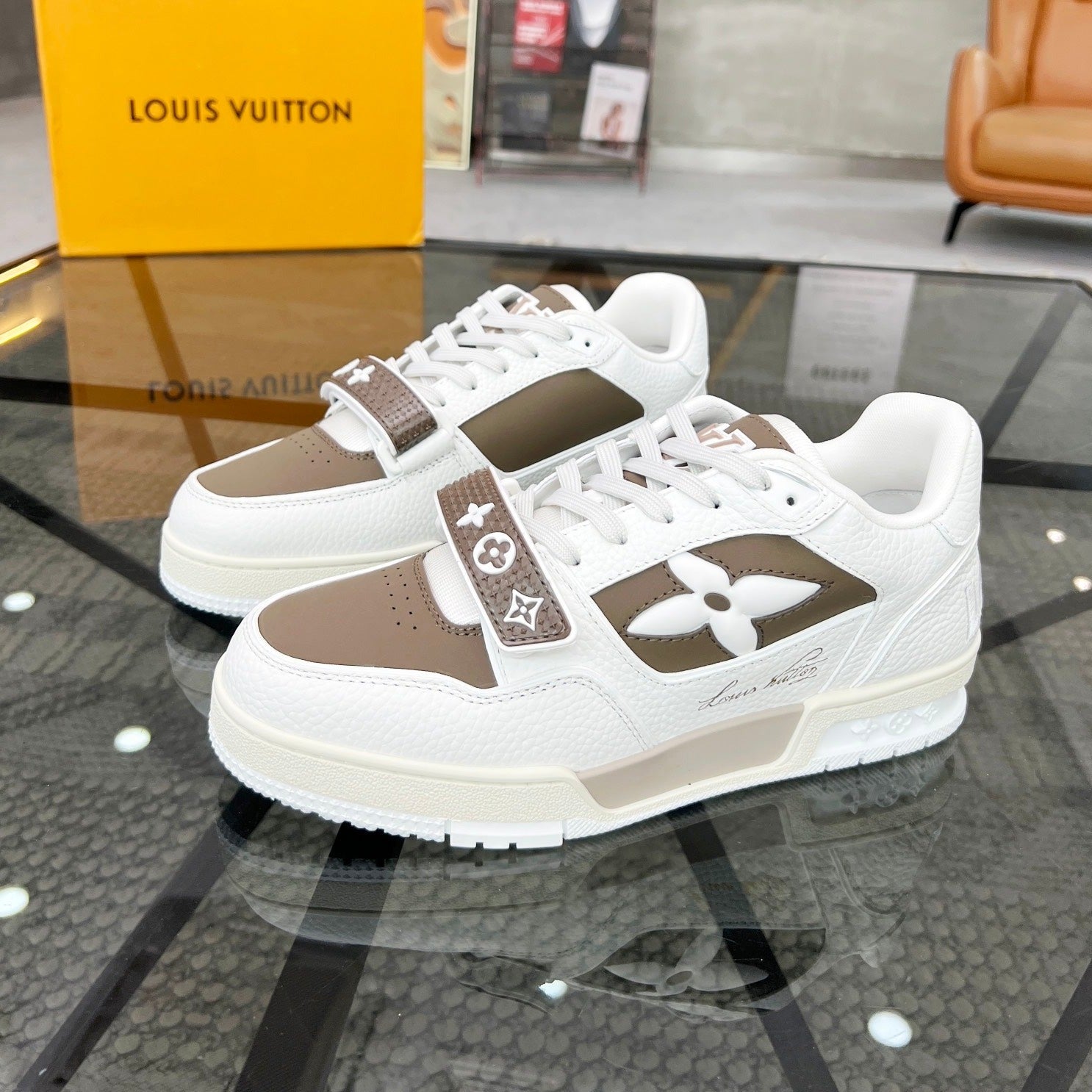 LV TRAINER SNEAKERS IN WHITE CALFSKIN AND MOCHA BROWN SUEDE