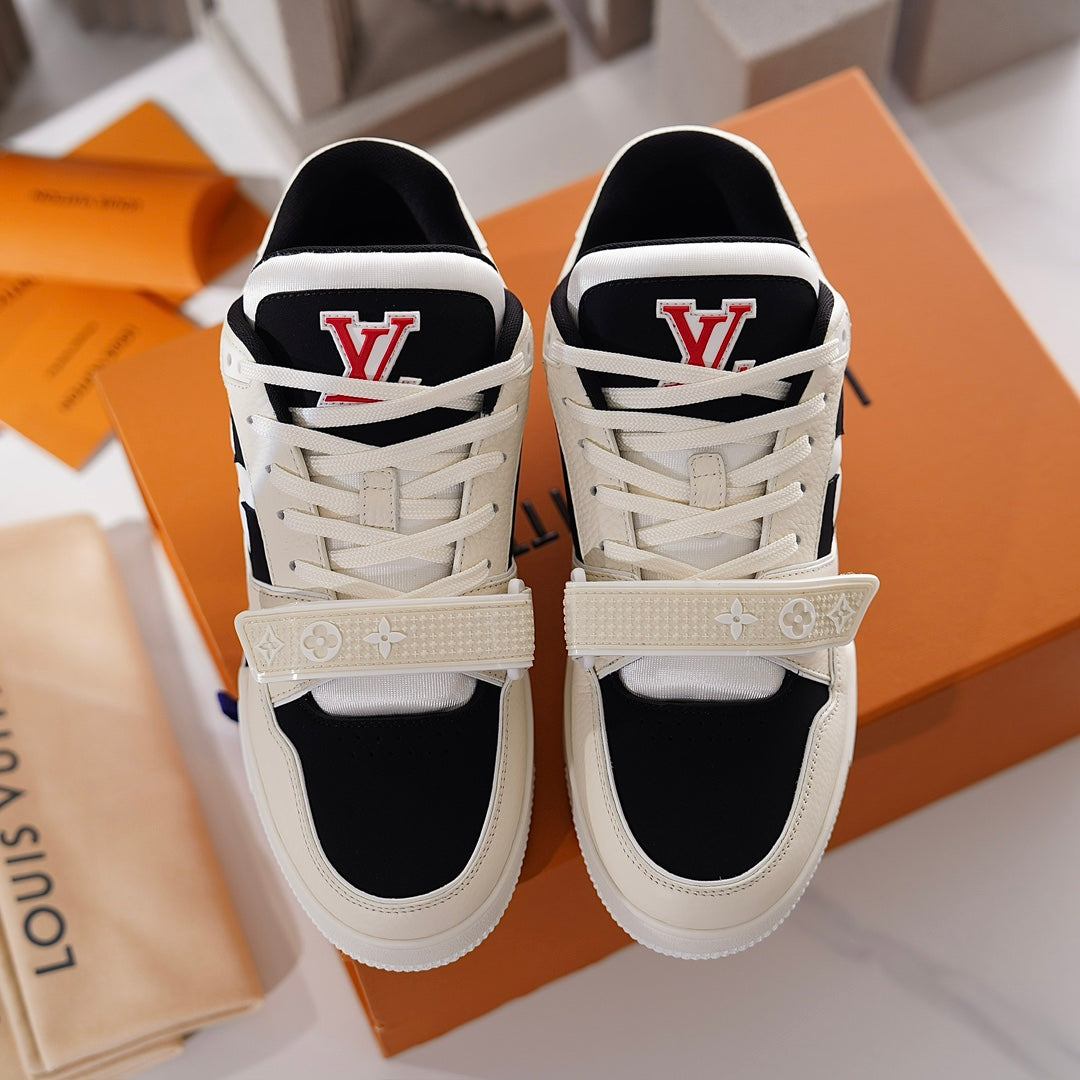 LV TRAINER SNEAKERS IN WHITE CALFSKIN AND BLACK MIX RED SUEDE
