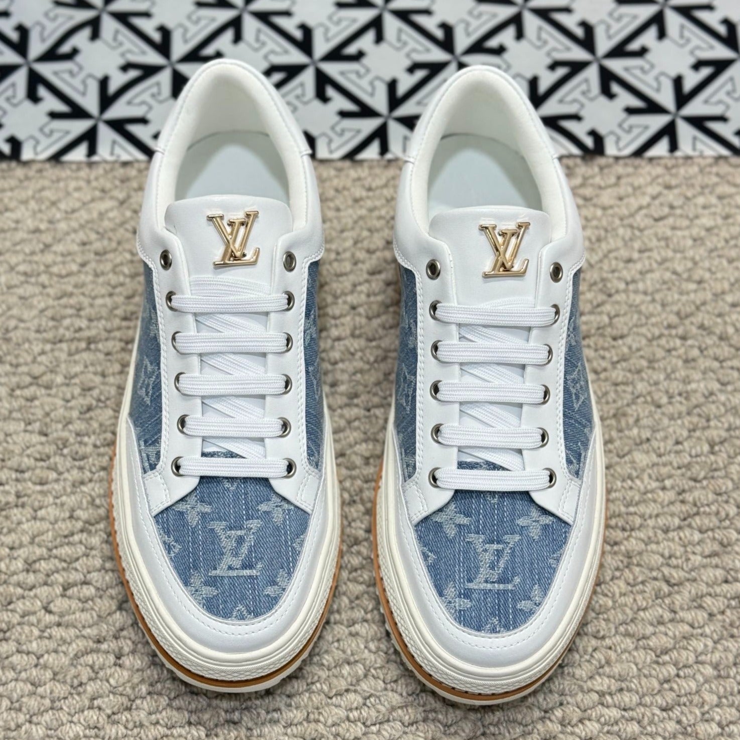 LV TRAINERS IN WHITE CALFSKIN AND BLUE DENIM JACQUARD