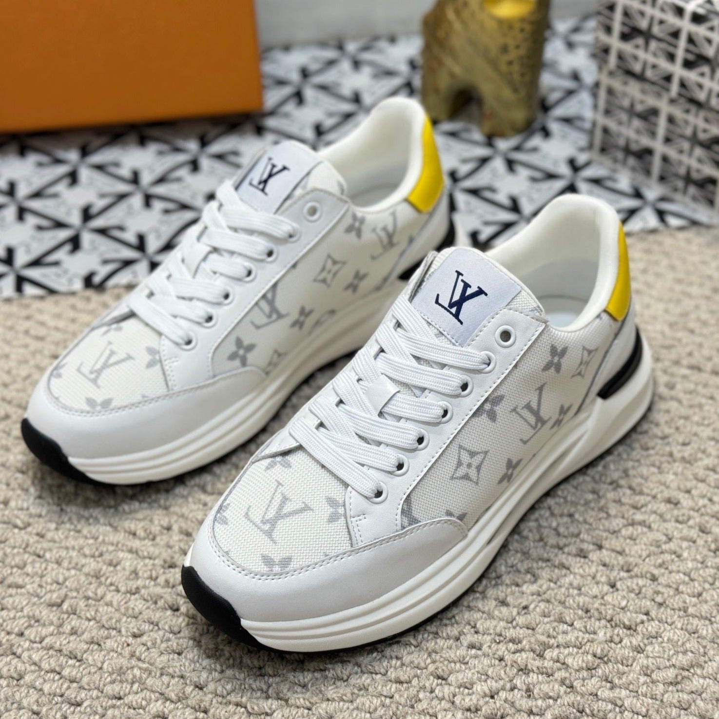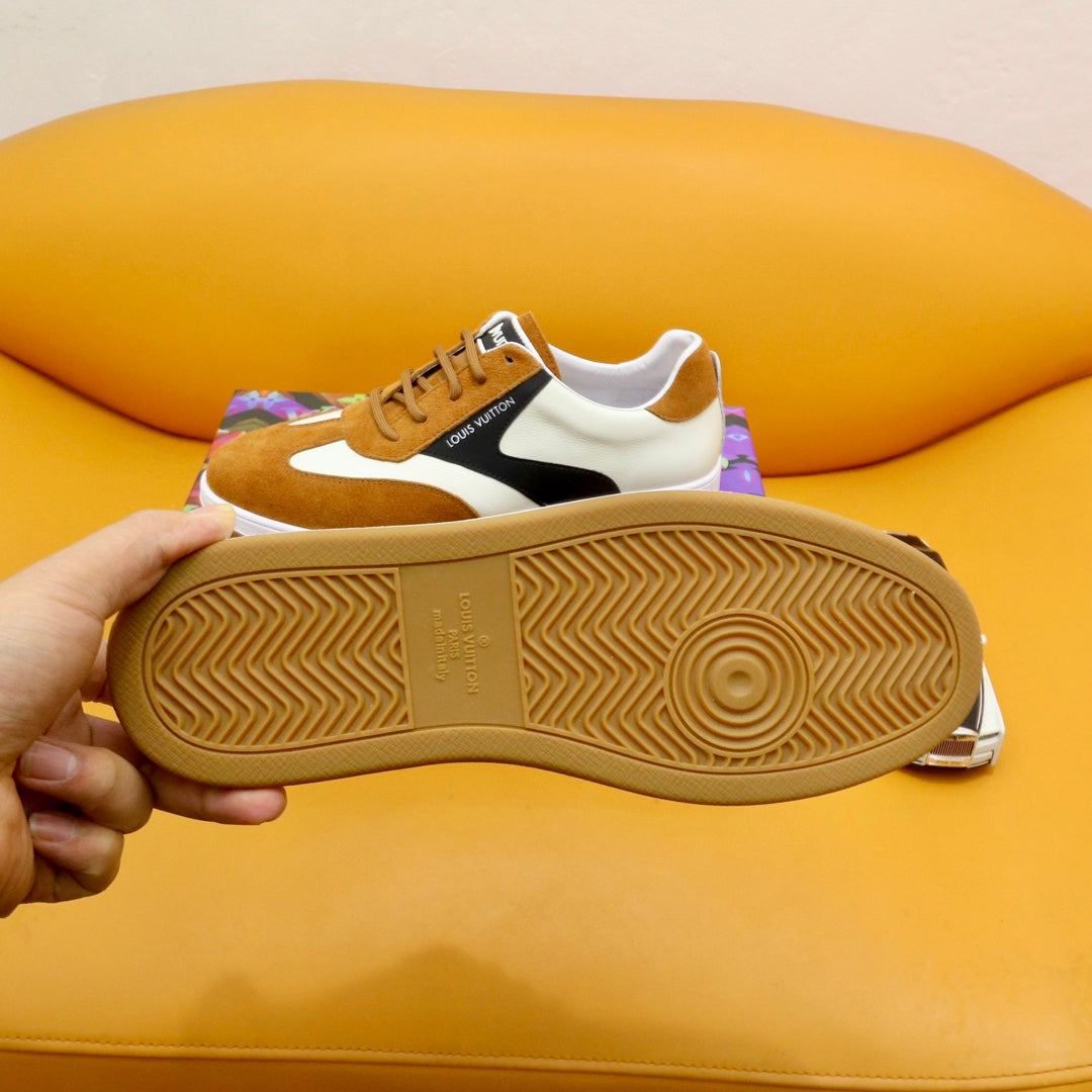 LV TRAINERS IN AMBER YELLOW SUEDE AND WHITE MIX BLACK CALFSKIN