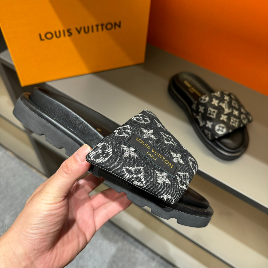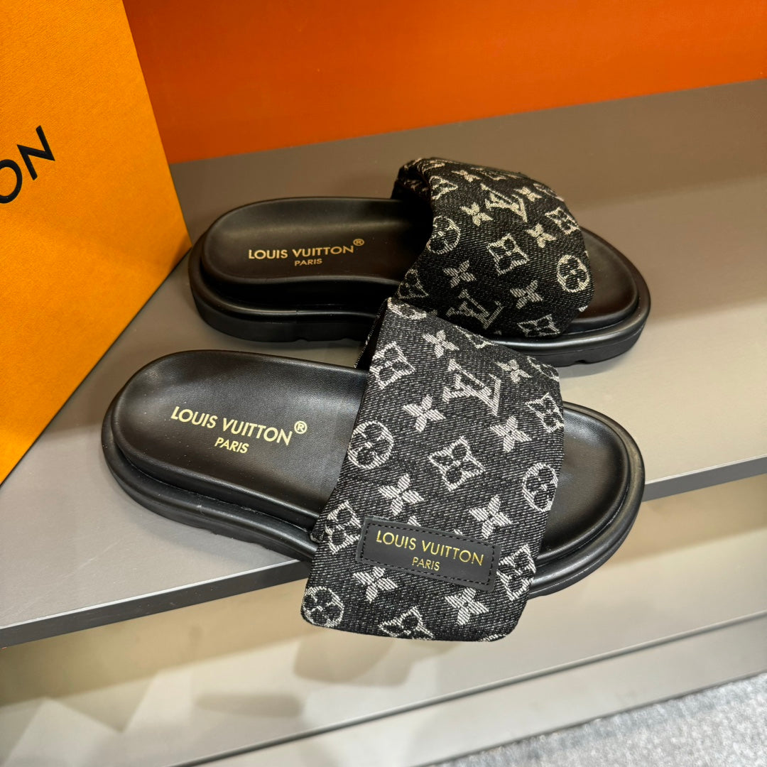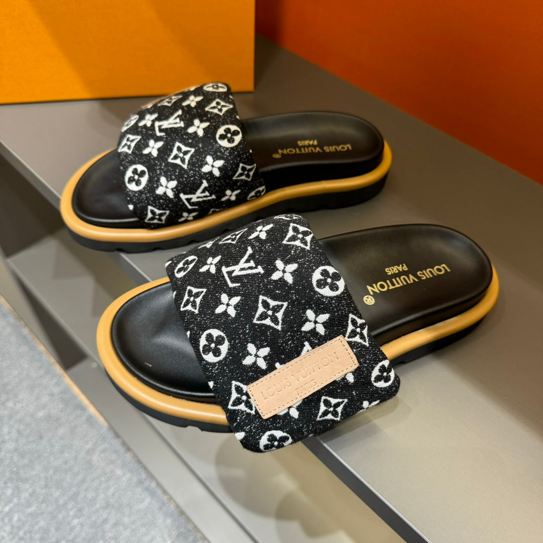LV VELCRO SLIPPERS IN BLACK MIX WHITE MONOGRAM JACQUARD