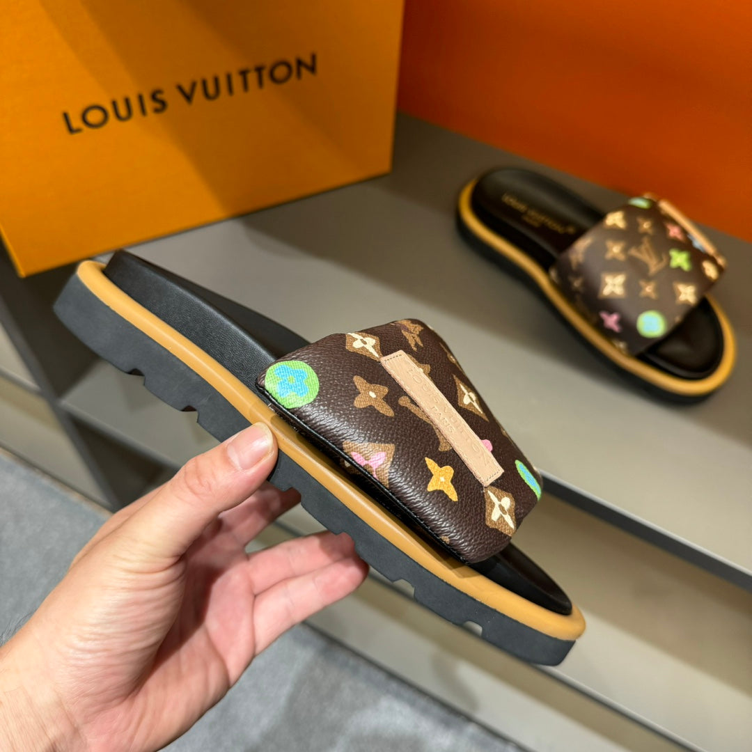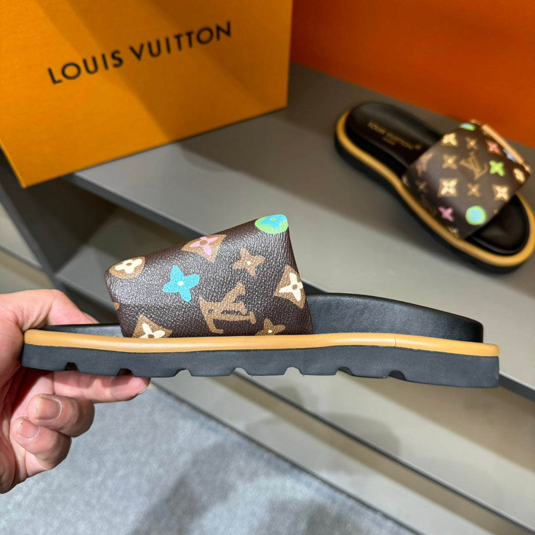 LV VELCRO SLIPPERS GREEN MIX BROWN DAMIER MONOGRAM CALFSKIN