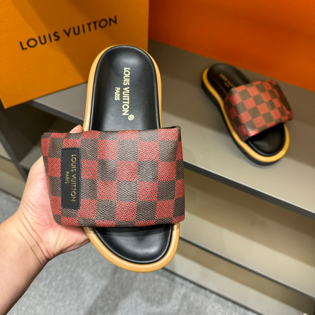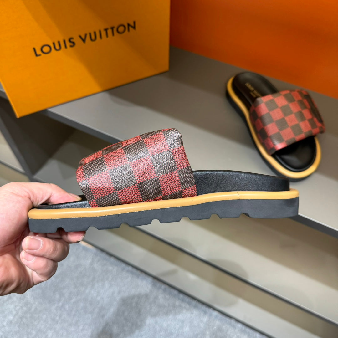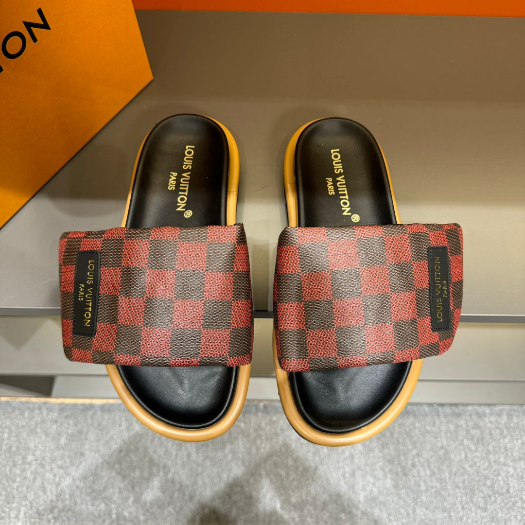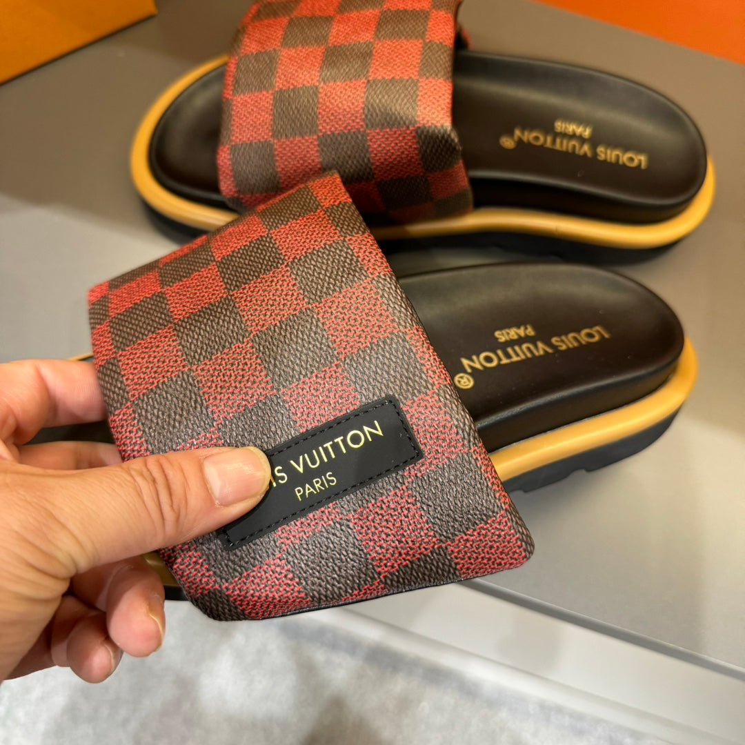 LV VELCRO SLIPPERS RED MIX BLACK DAMIER MONOGRAM CALFSKIN