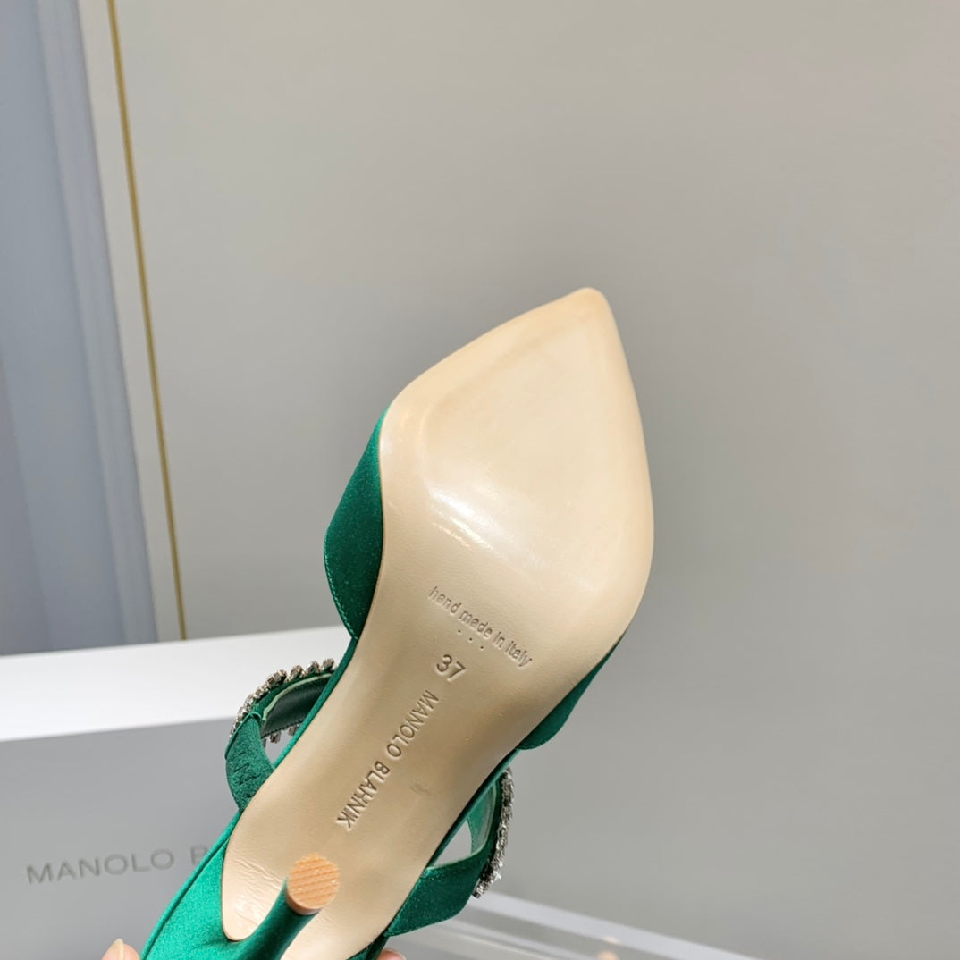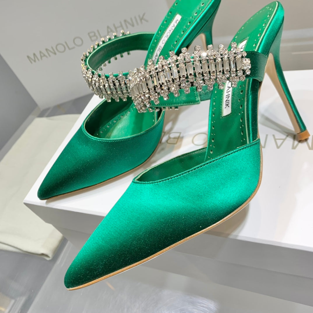Manolo Mules Crystal Green Silk Satin 219387