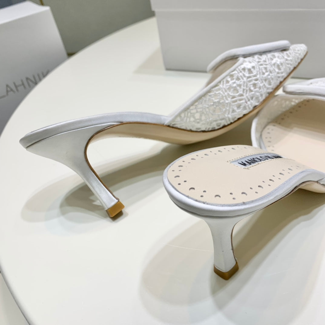 Manolo Mules 7cm White Hollow Lace Leather Bottom 451198