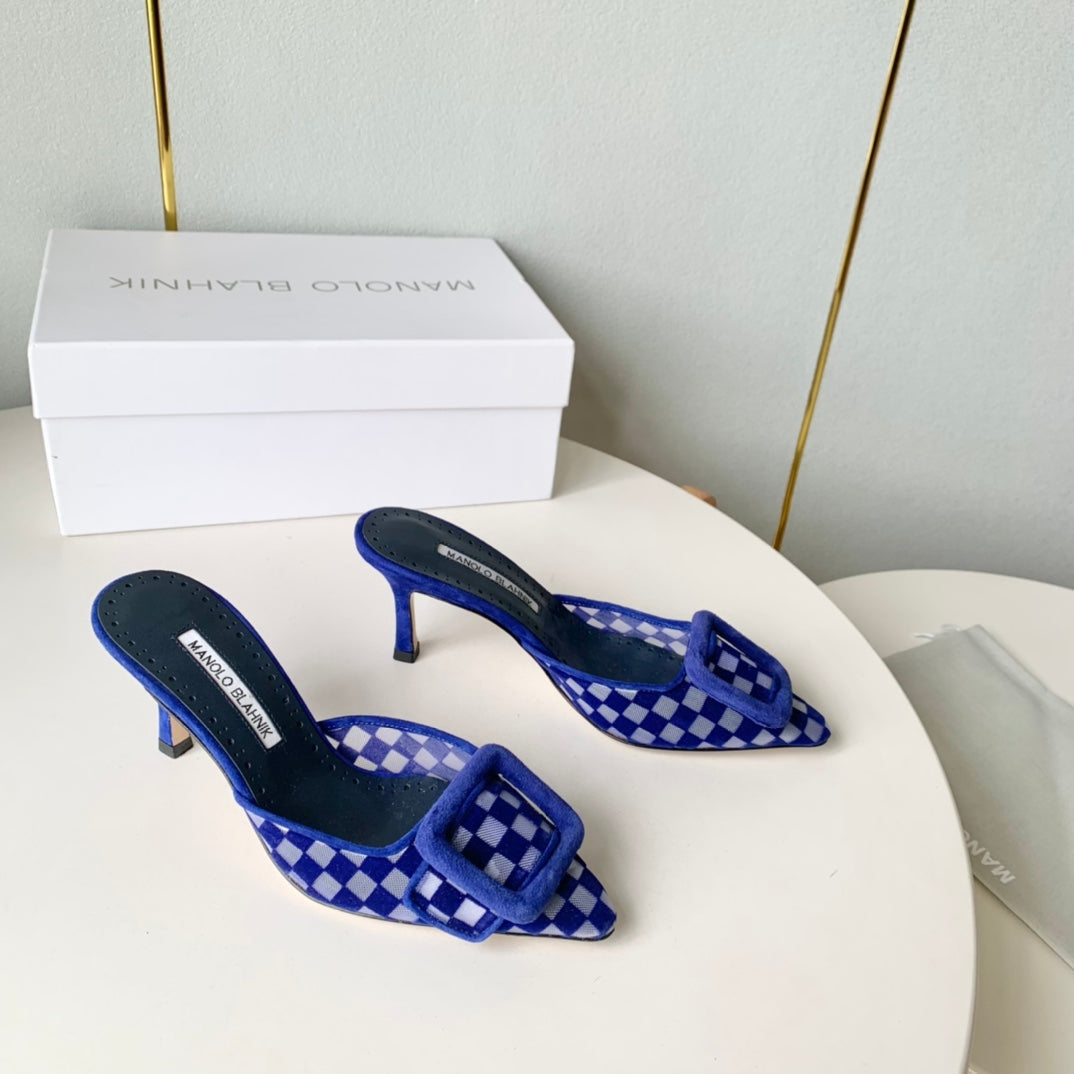 Manolo Mules Latest Checkerboard Blue Fabric Leather 528008