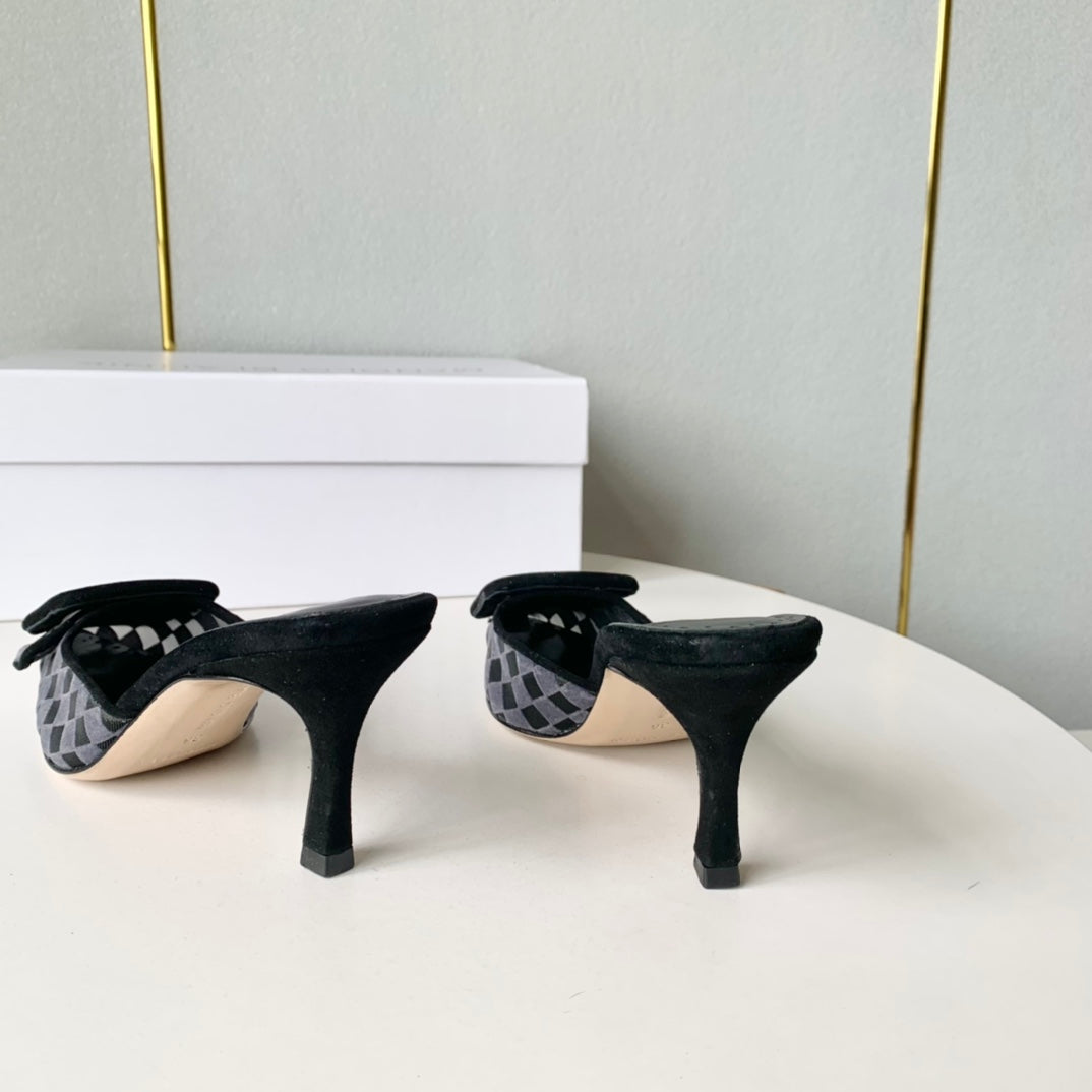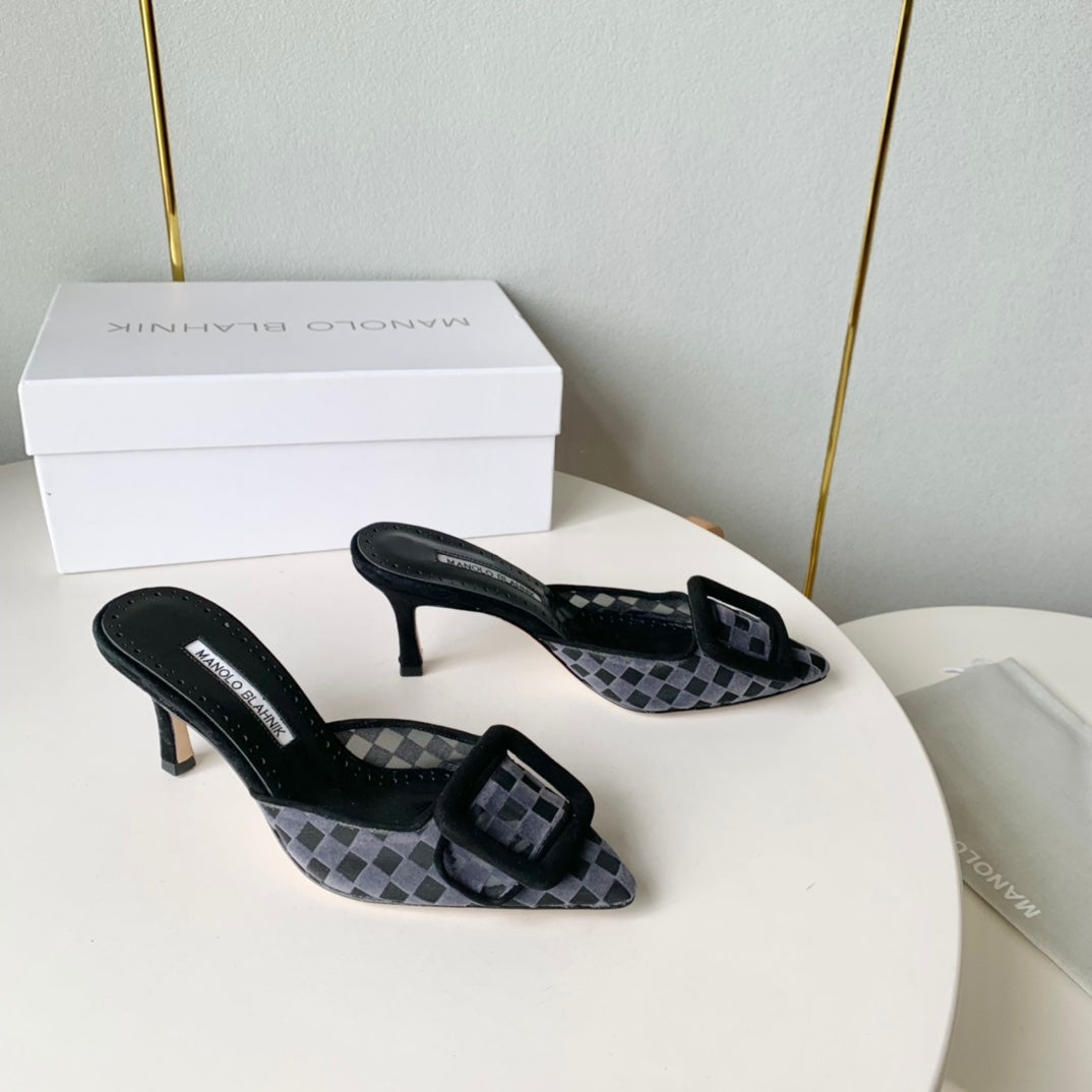 Manolo Mules Latest Checkerboard Black Fabric Leather 528010