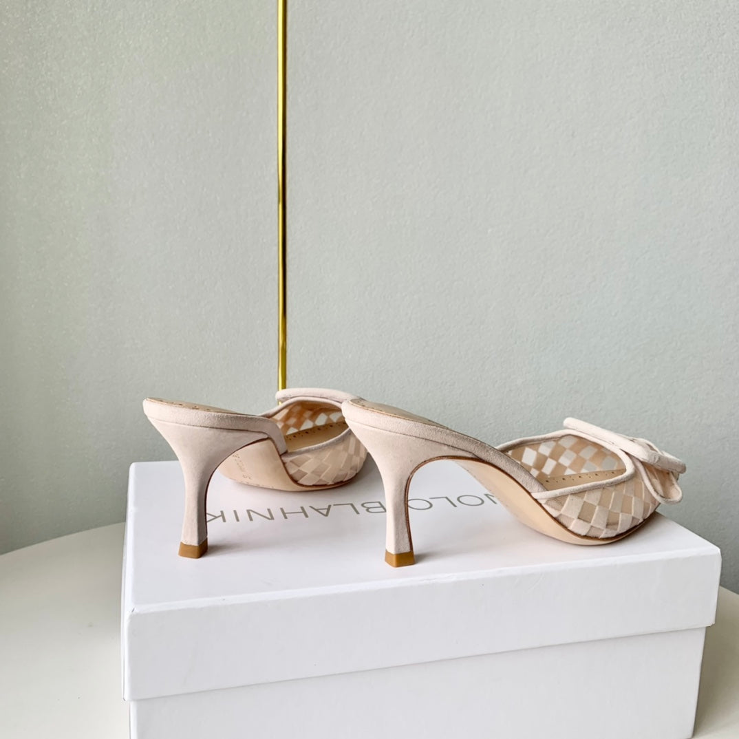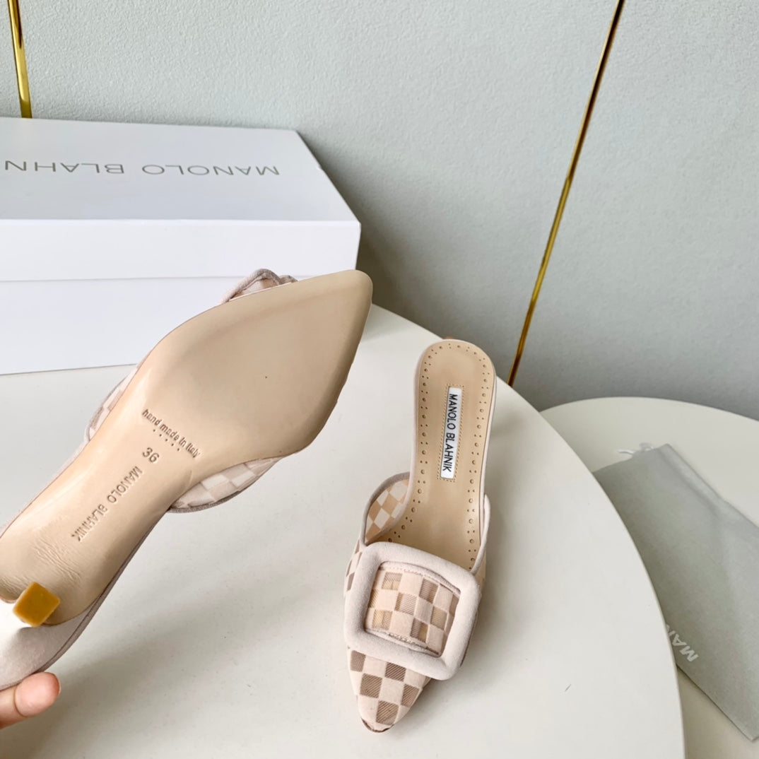 Manolo Mules Latest Checkerboard Beige Fabric Leather 528011