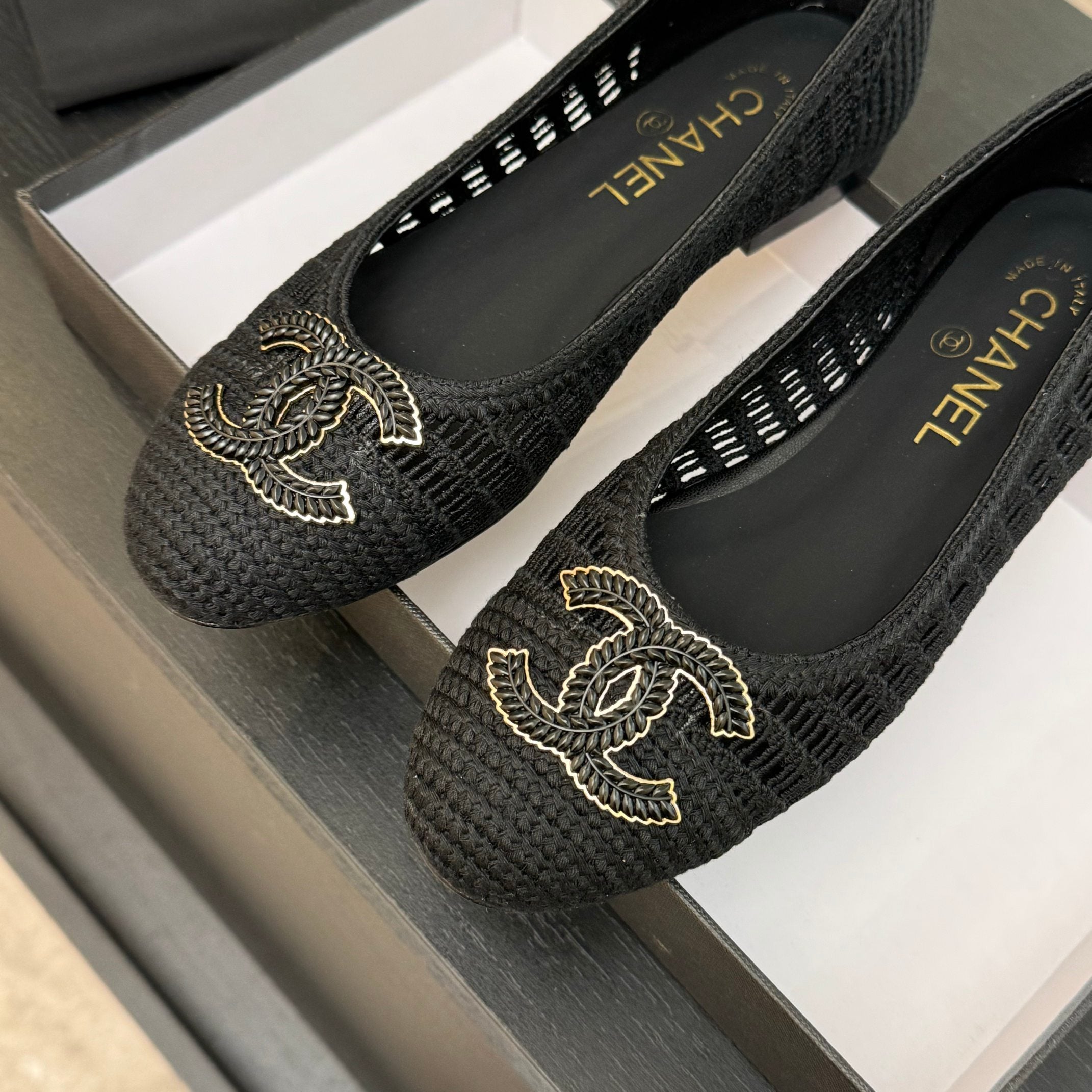 CC 25P Ballet Flat Flower Black Calfskin Patent Calfskin
