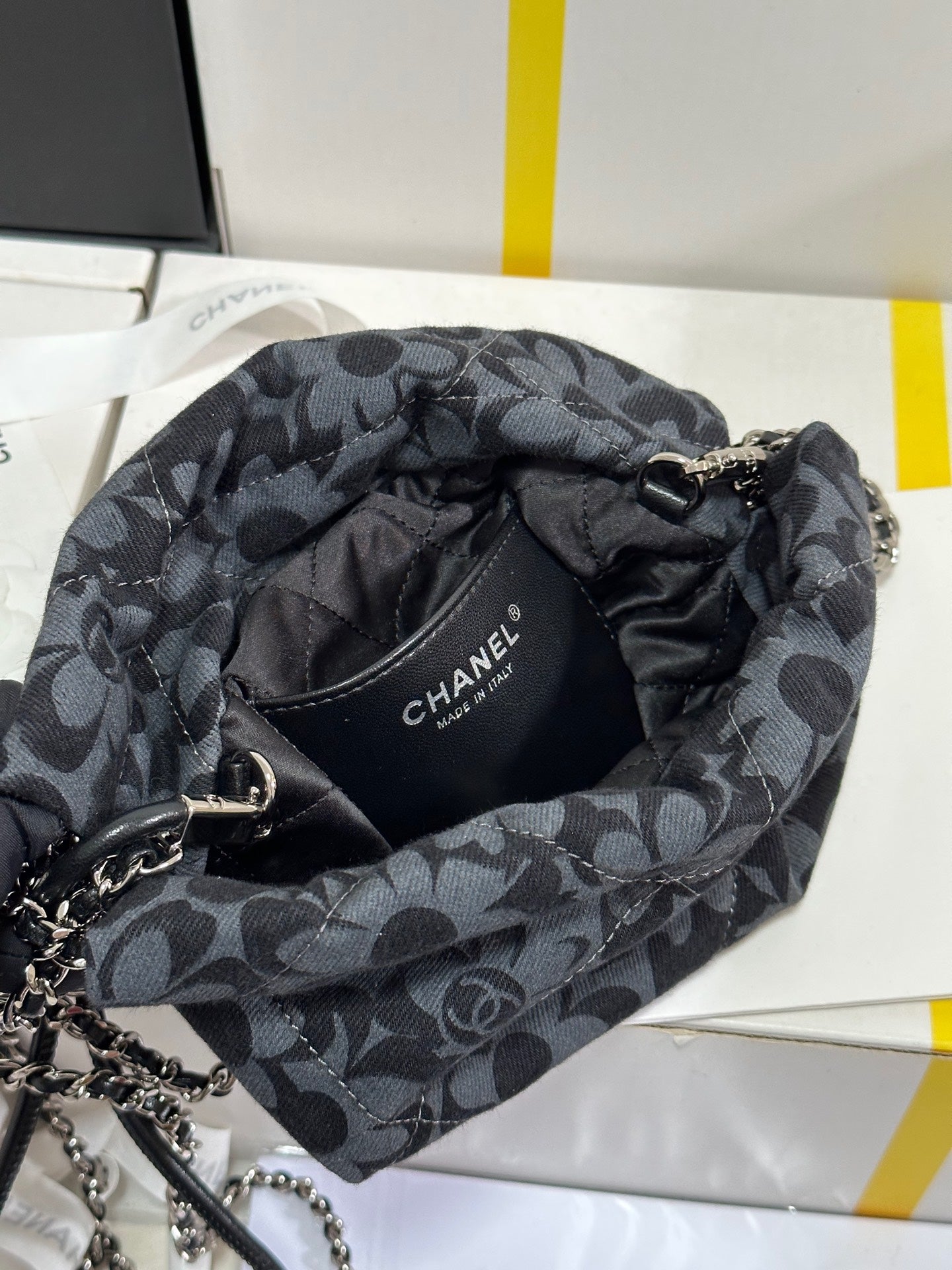 CC 22 Bag Mini Gray Black Camellia Pattern Demin Silver Hardware 243630