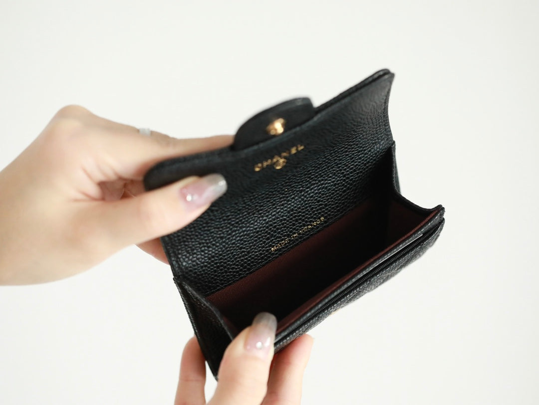 CC FLAP CARD HOLDER 11.3 BLACK GRAINED CALFSKIN GOLD ICON