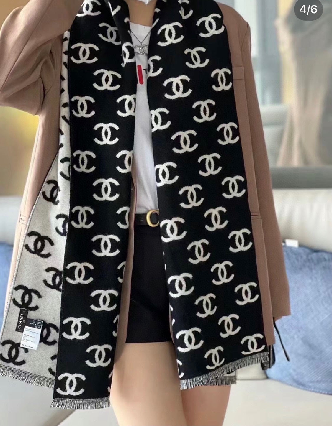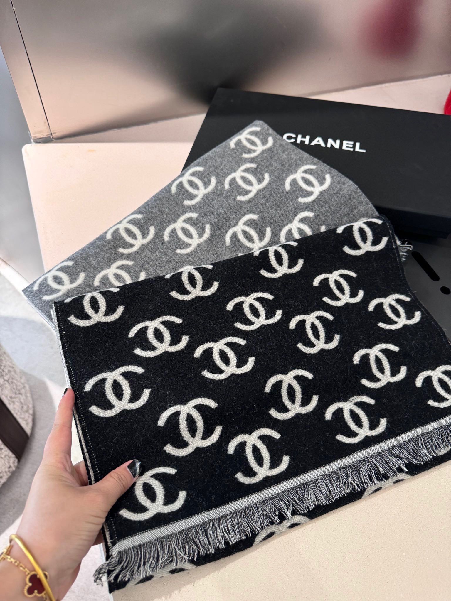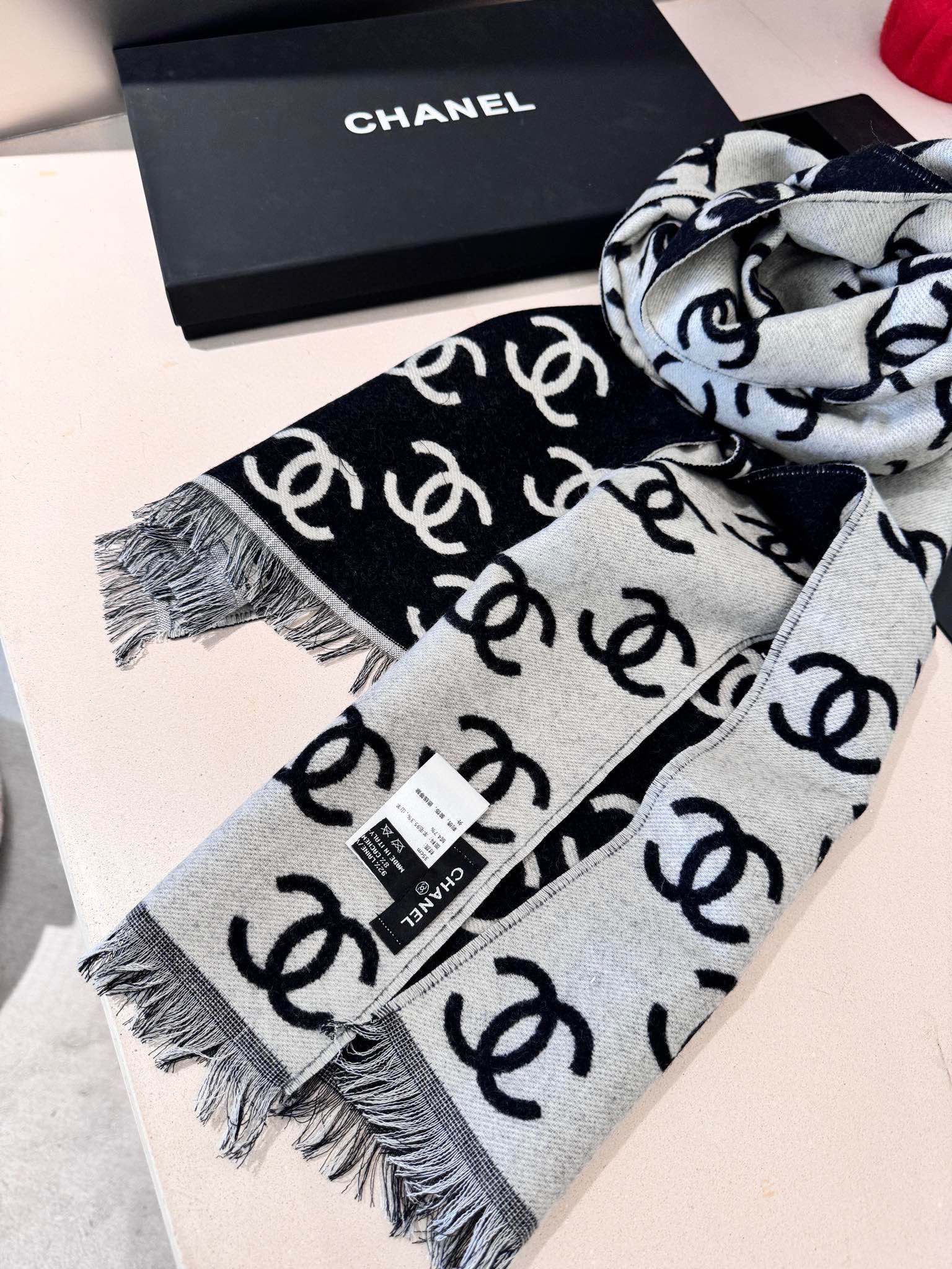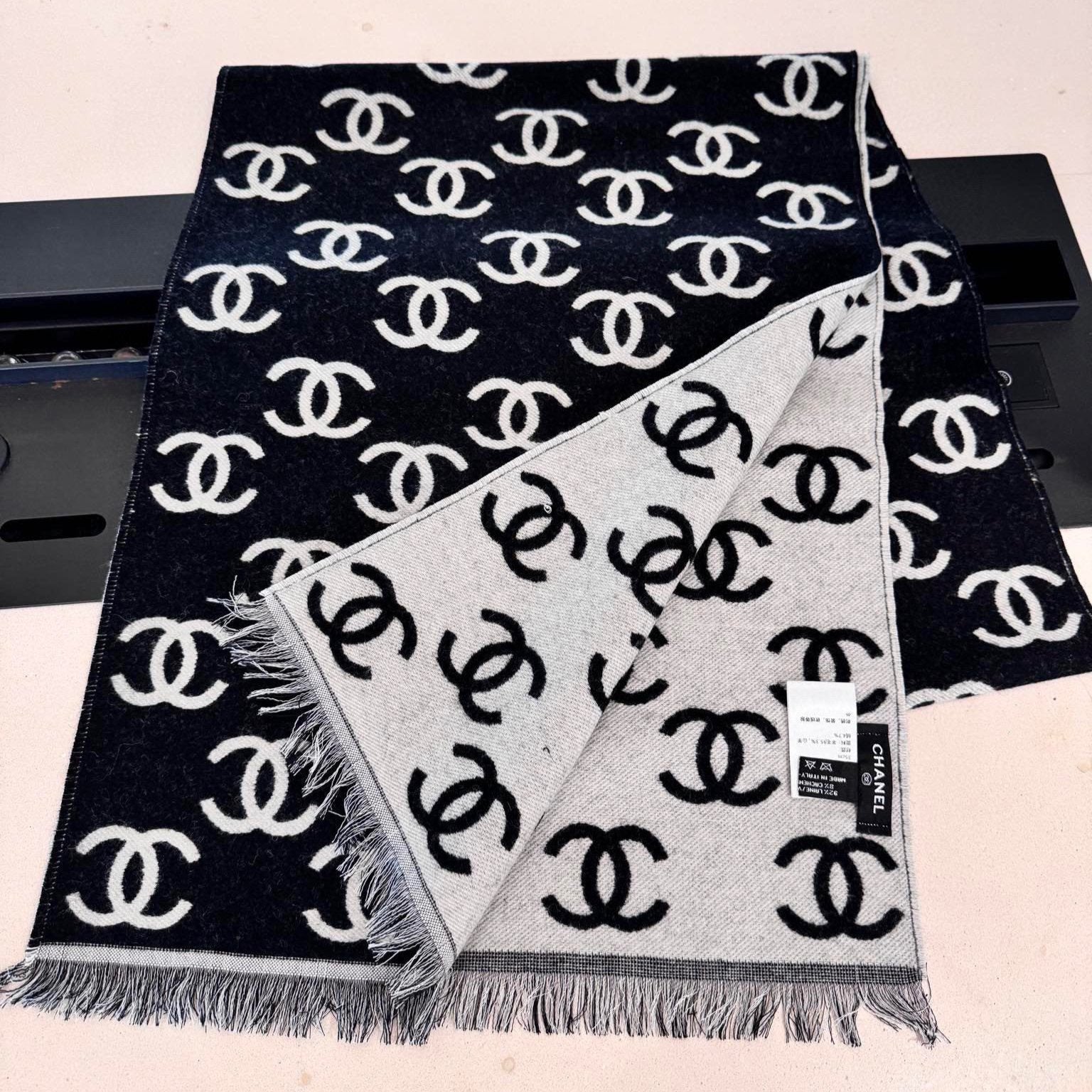 CC Scarf 180 CM In Black Mix Light Grey Print Logo Wool And Cashmere 359270
