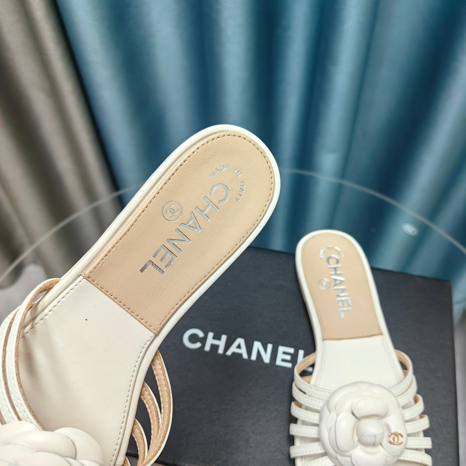 Camellia Slide Slippers Beige Cream Lambskin