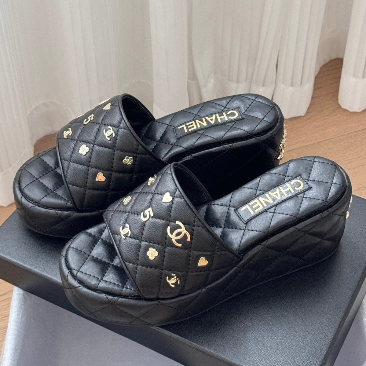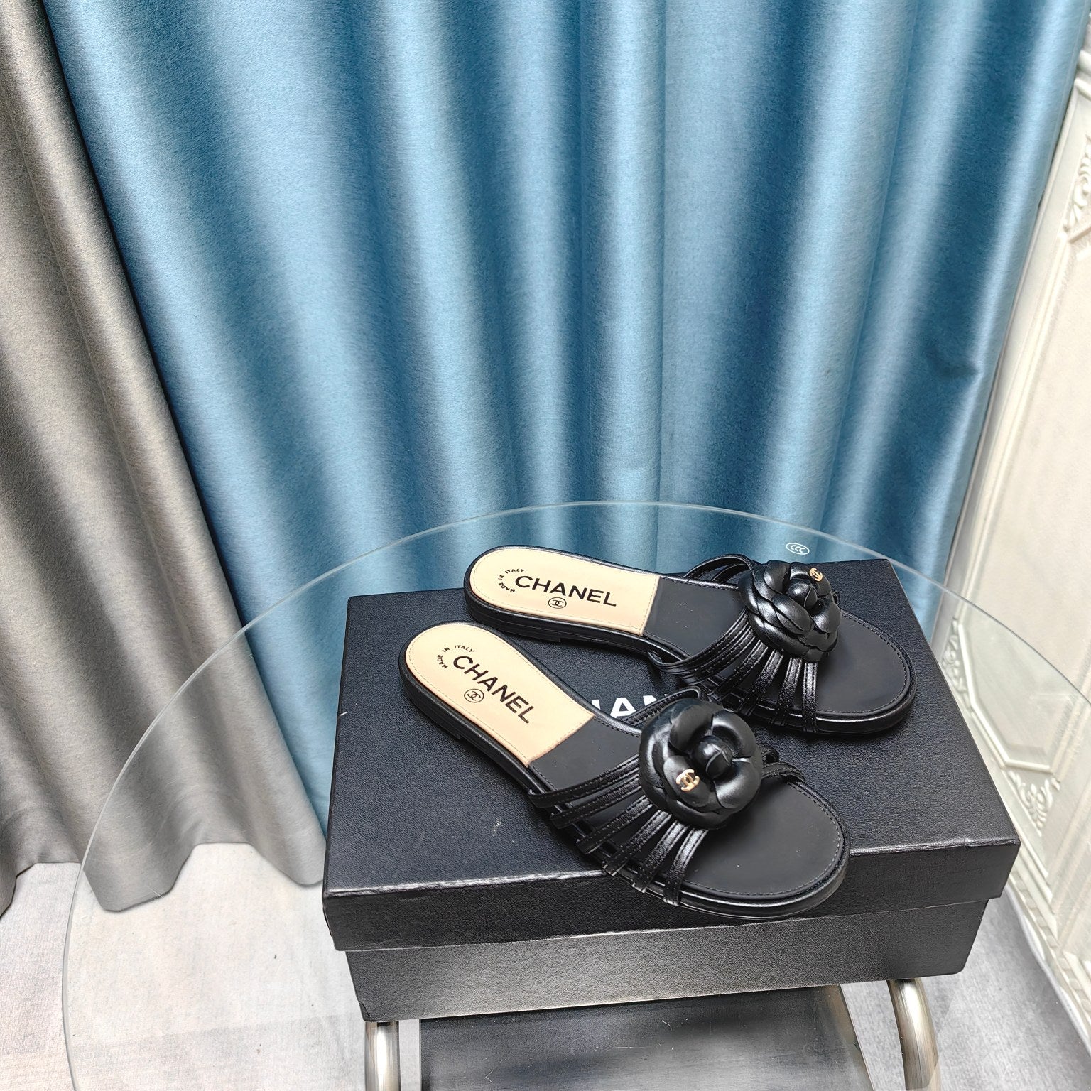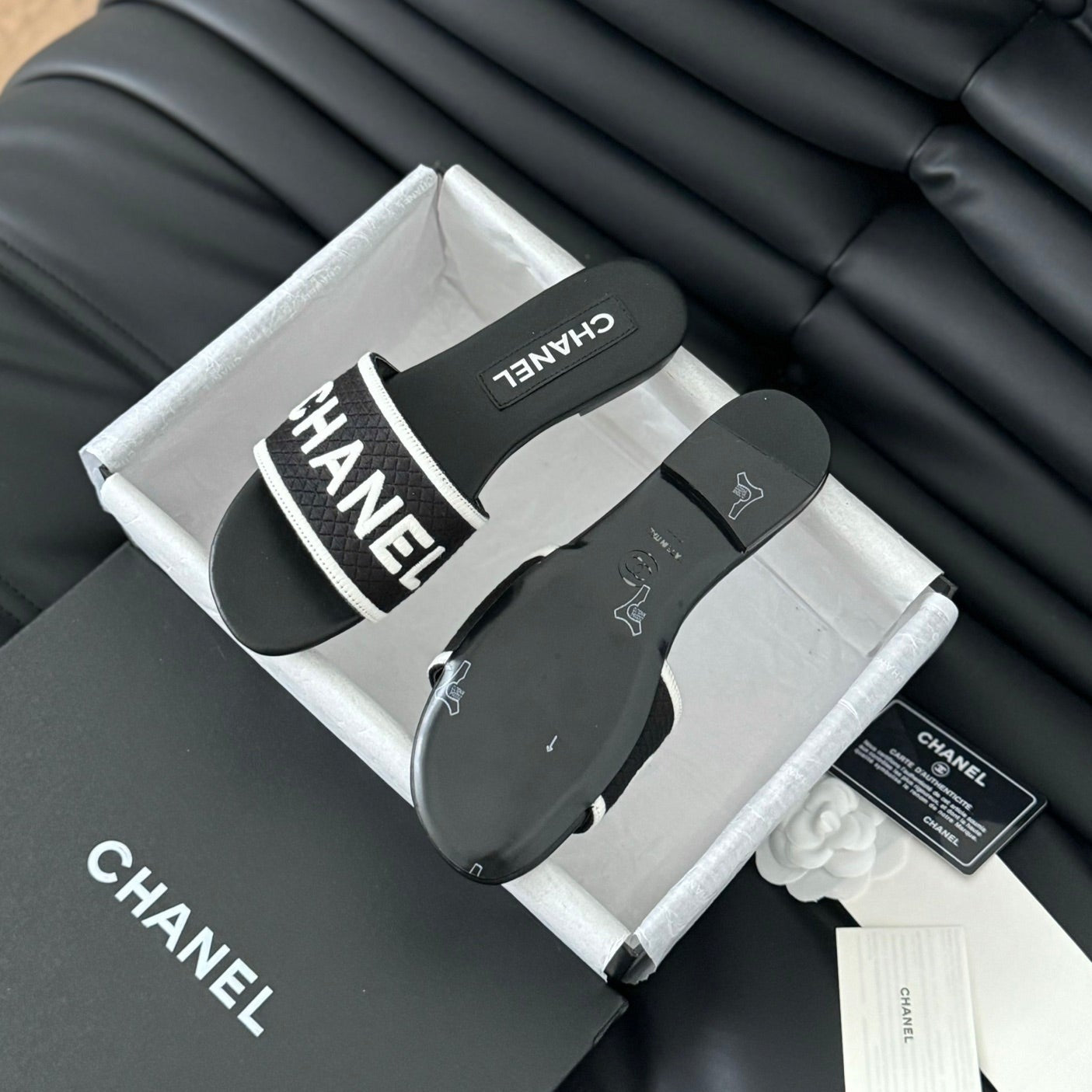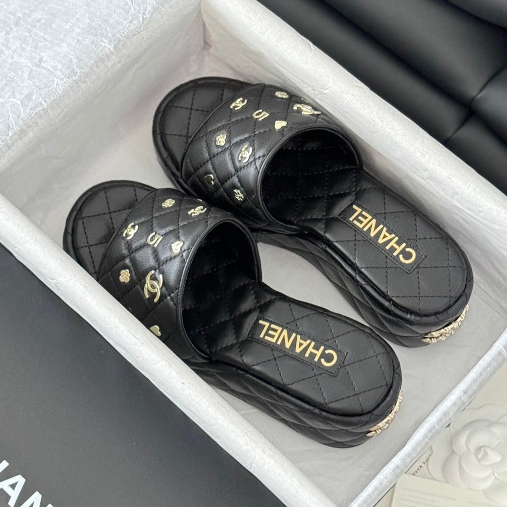 Camellia Slide Slippers Black Lambskin