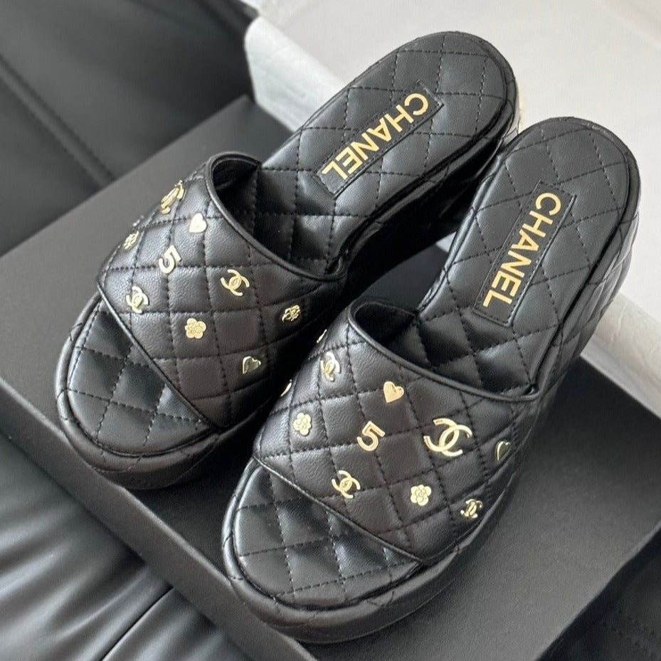 Camellia Slide Wedge Sandal Black Lambskin