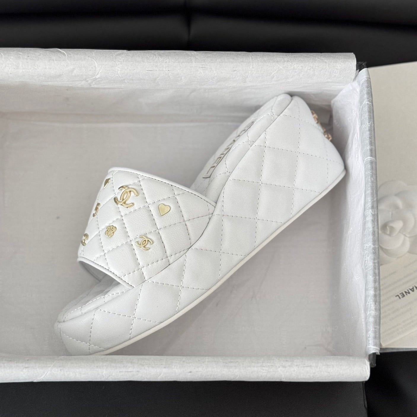Camellia Slide Slippers White Lambskin