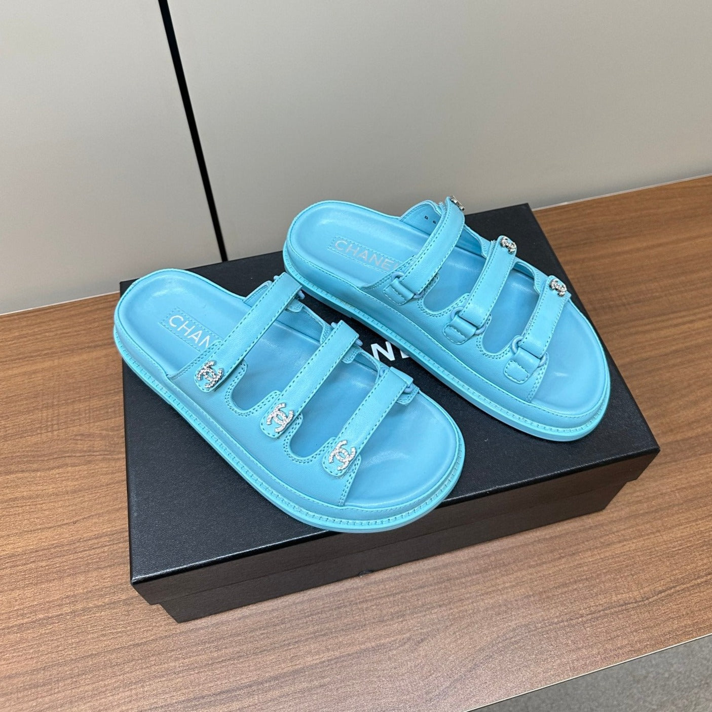 dad sandals sky blue triple strap lambskin mules