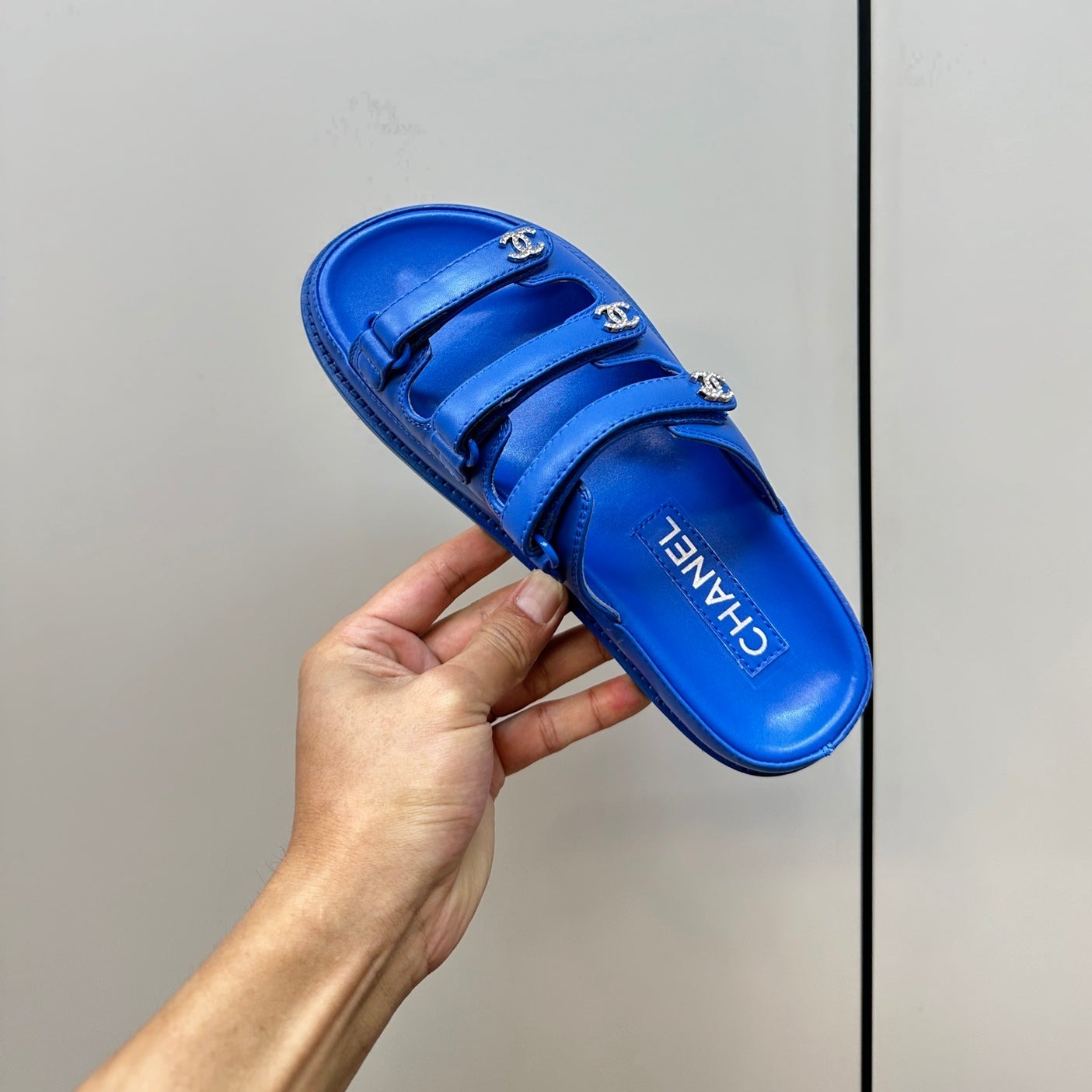dad sandals dodger blue triple strap lambskin mules