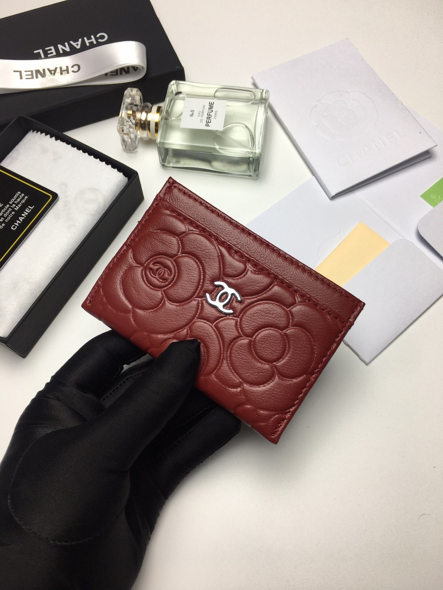 CC FLORAL CARD HOLDER 11.2 GARNET CALFSKIN SILVER ICON