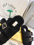 FENDI DAD SANDAL MULE IN BLACK SUEDE WITH FLEECE WITH GOLD HARDWARE