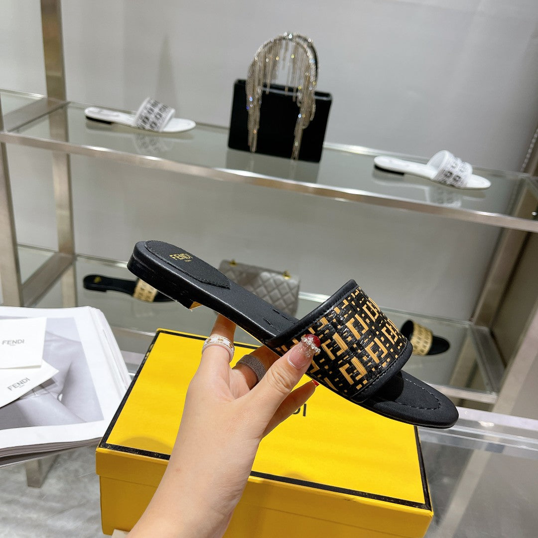 FENDI FLAT SLIPPER IN CEDAR BROWN MIX BLACK MONOGRAM JACQUARD FABRIC WITH GOLD HARDWARE