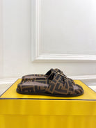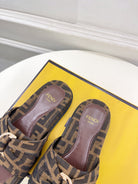 FENDI FLAT SLIPPER IN CHOCOLATE BROWN MONOGRAM JACQUARD FABRIC WITH GOLD HARDWARE