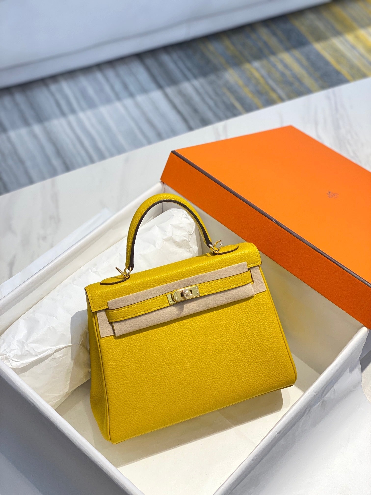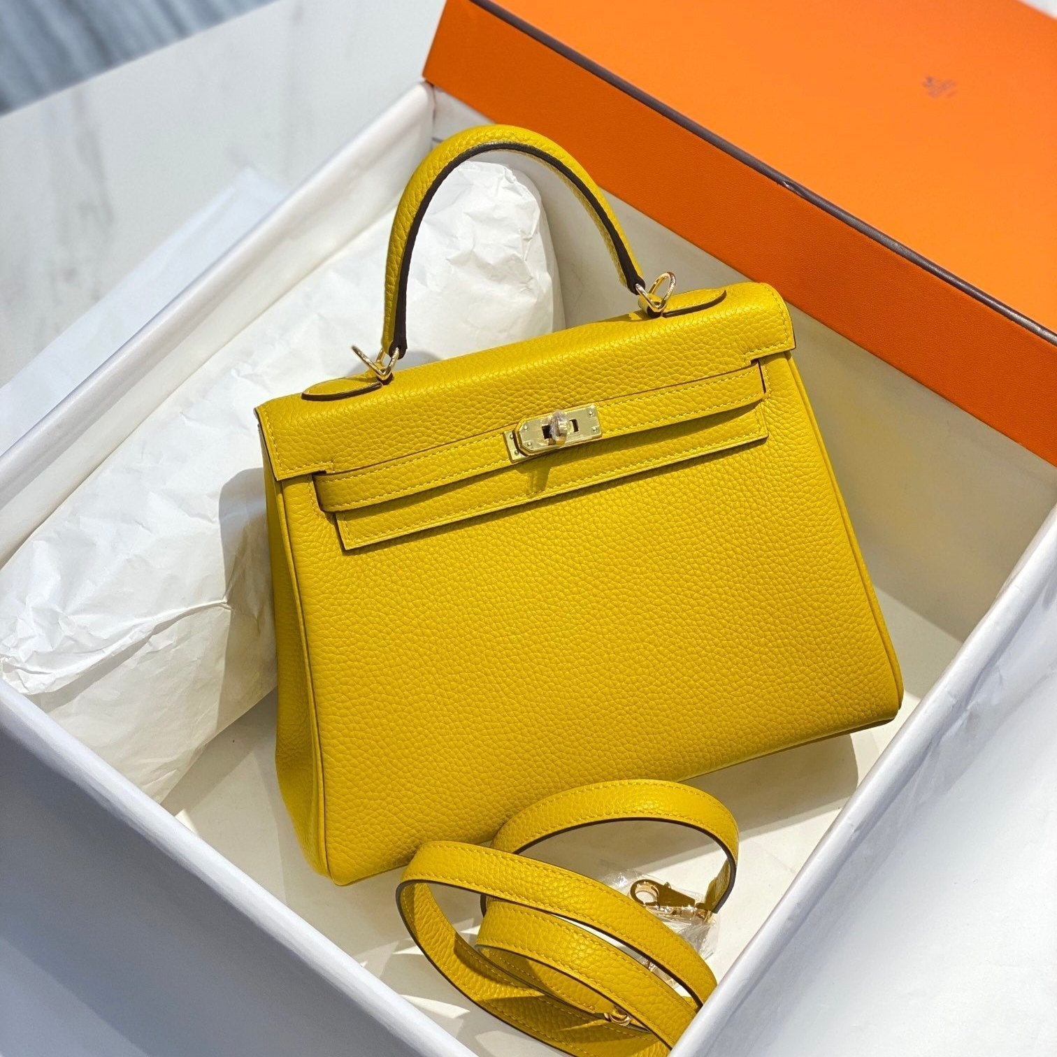 HM KELLY 32CM BAG IN LEMON TOGO GOLD HARDWARE