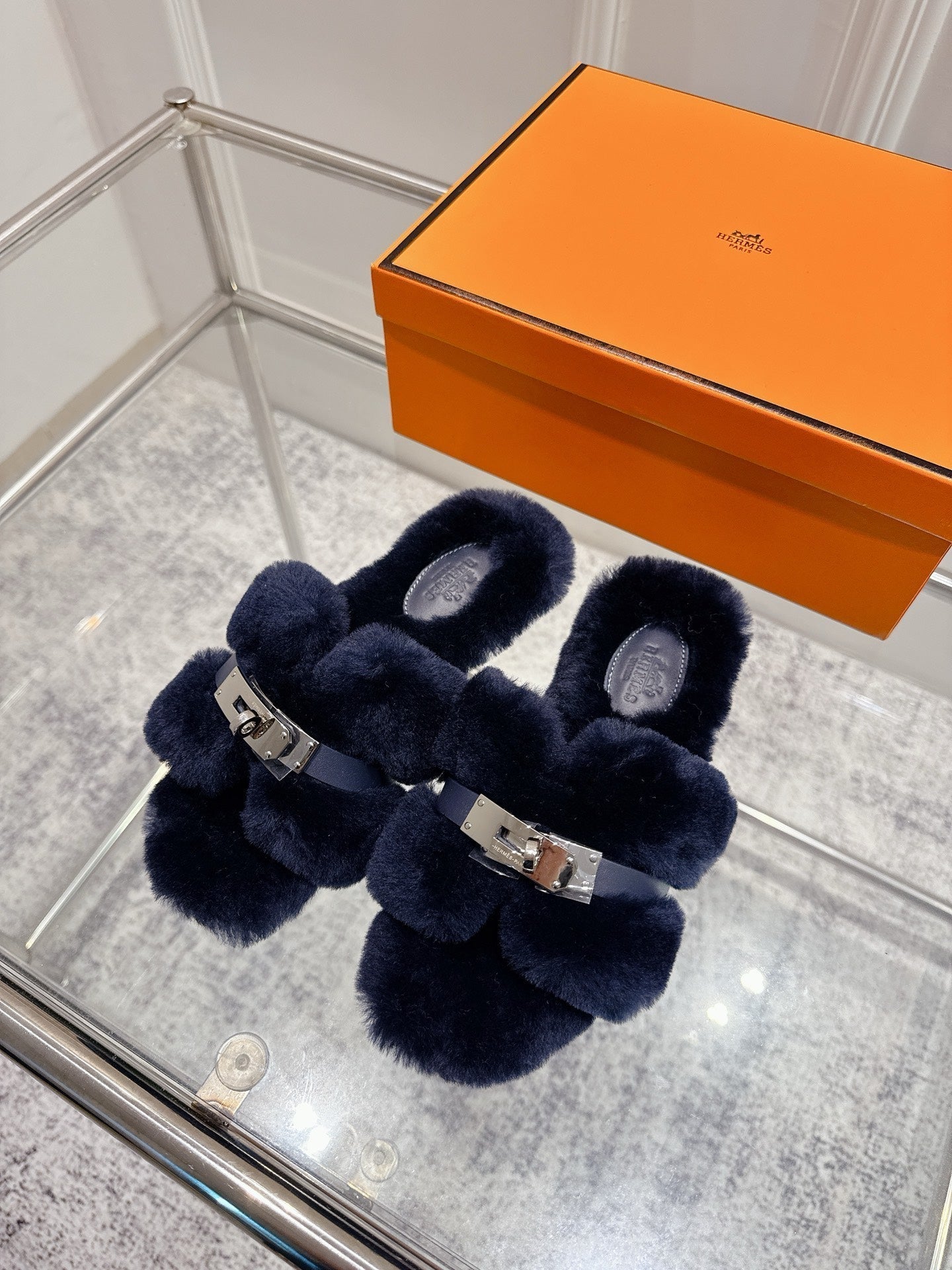 HM Oran slippers sliver buckle navy blue wool