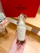 Double Rockstud Grainy Calfskin Wedge Sandal In Light Yellow Metallic Cowhide And Raffia 852839