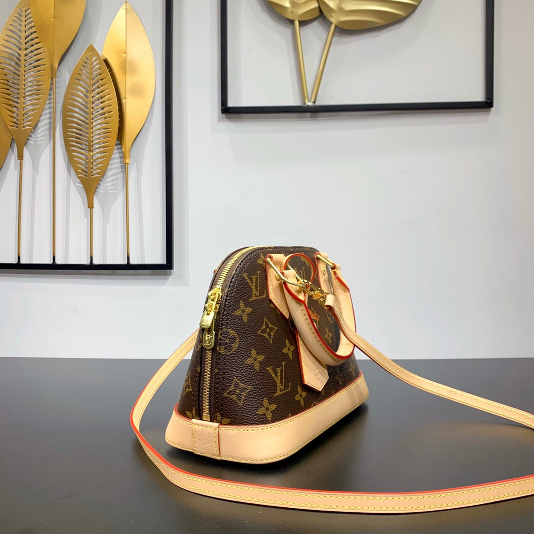 ALMA BB 23 IN BROWN MONOGRAM CANVAS AND BEIGE CALFSKIN TRIM GOLD BUCKLE