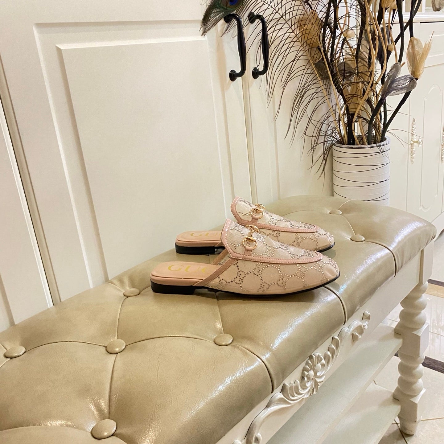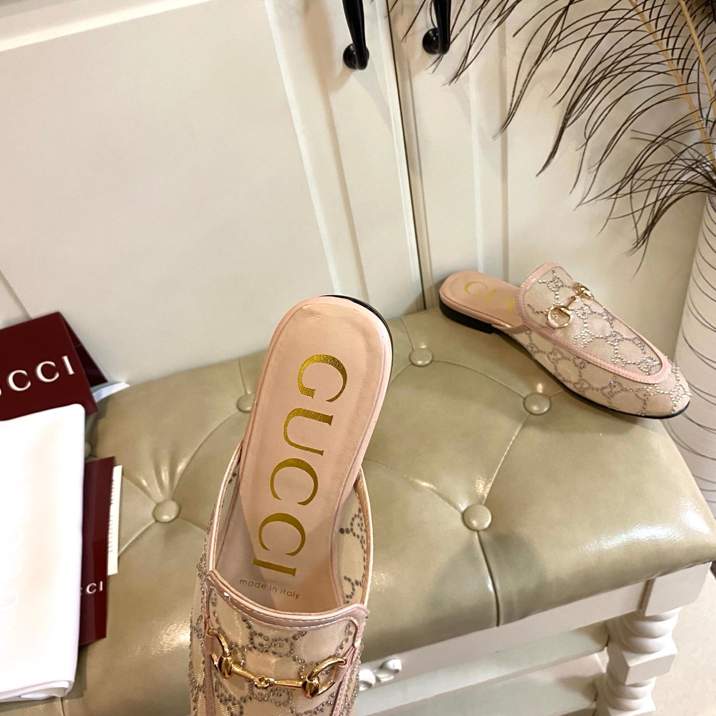 GG Horsebit Slingback Flat Beige Ebony Monogram Canvas Point Toe Crystal-Embellished