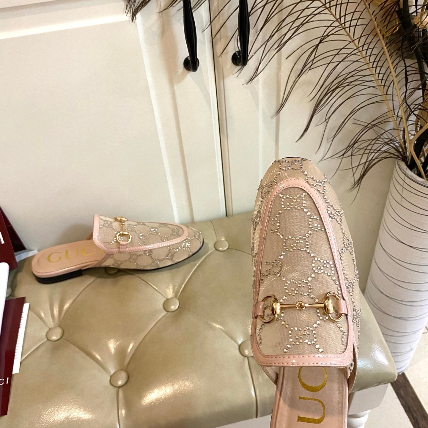 GG Horsebit Slingback 85MM Beige Pink Monogram Canvas Point Toe Crystal-Embellished