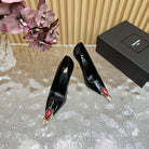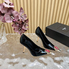 RED GEM-STUDDED HIGH PUMPS IN BLACK PATENT CALFSKIN