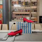 TRIANGLE LOGO PUMPS IN RED SATIN