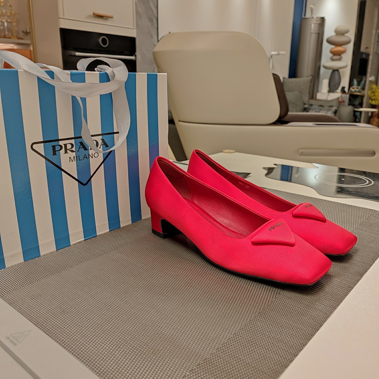 TRIANGLE LOGO PUMPS IN RED SATIN