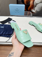 PRA SAFFIANO PATENT SLIDES OSTRICH MOTIF SEAFOAM CALFSKIN