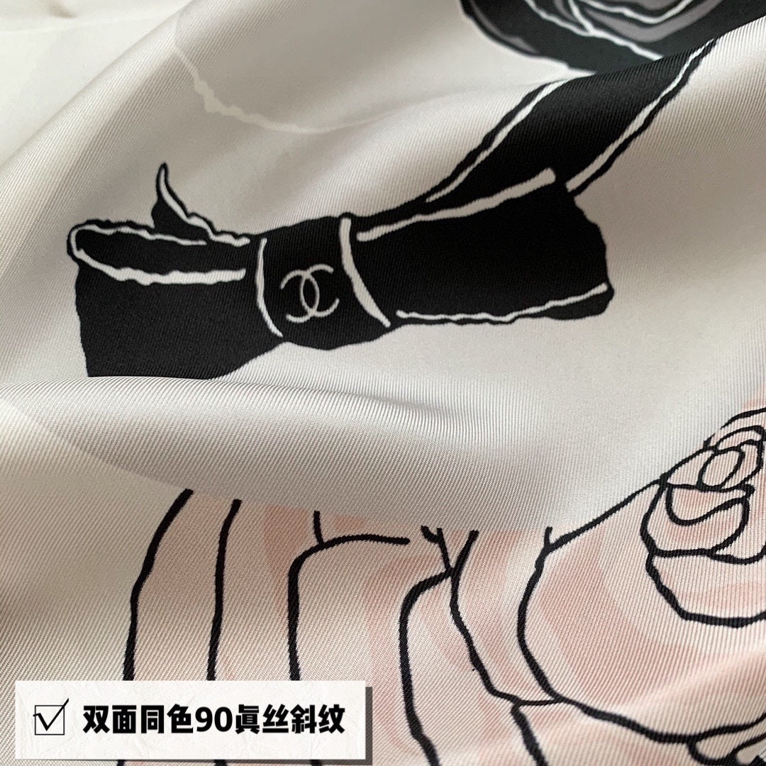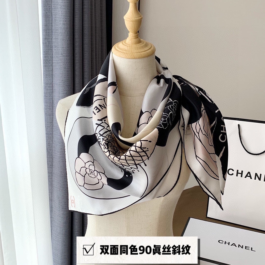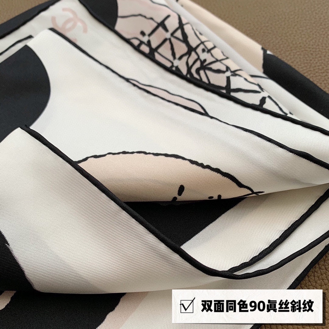 CC Square Scarf 90 CM In White Black Mix Light Beige Silk 288700