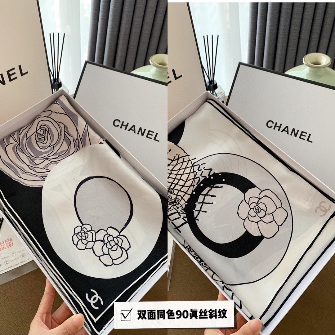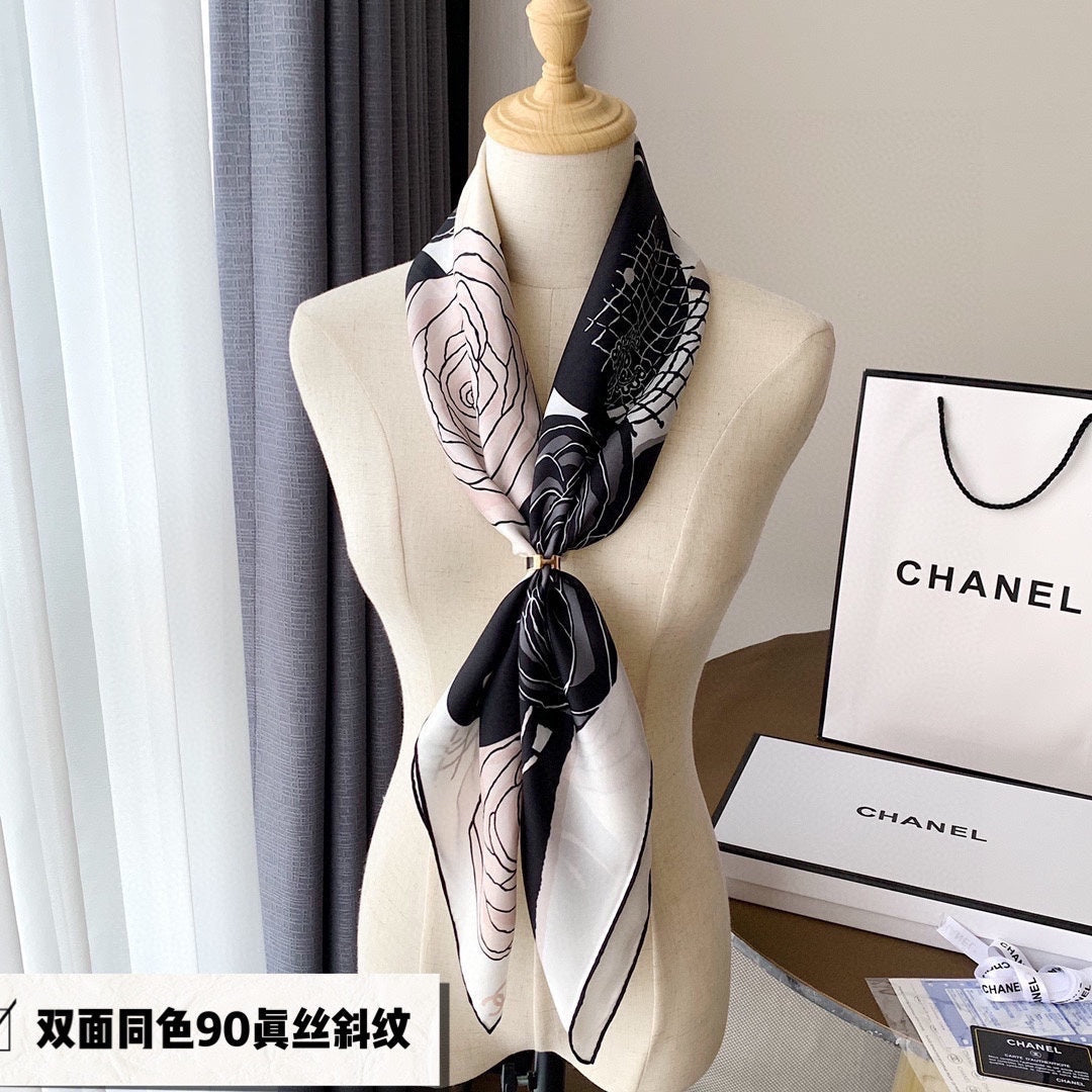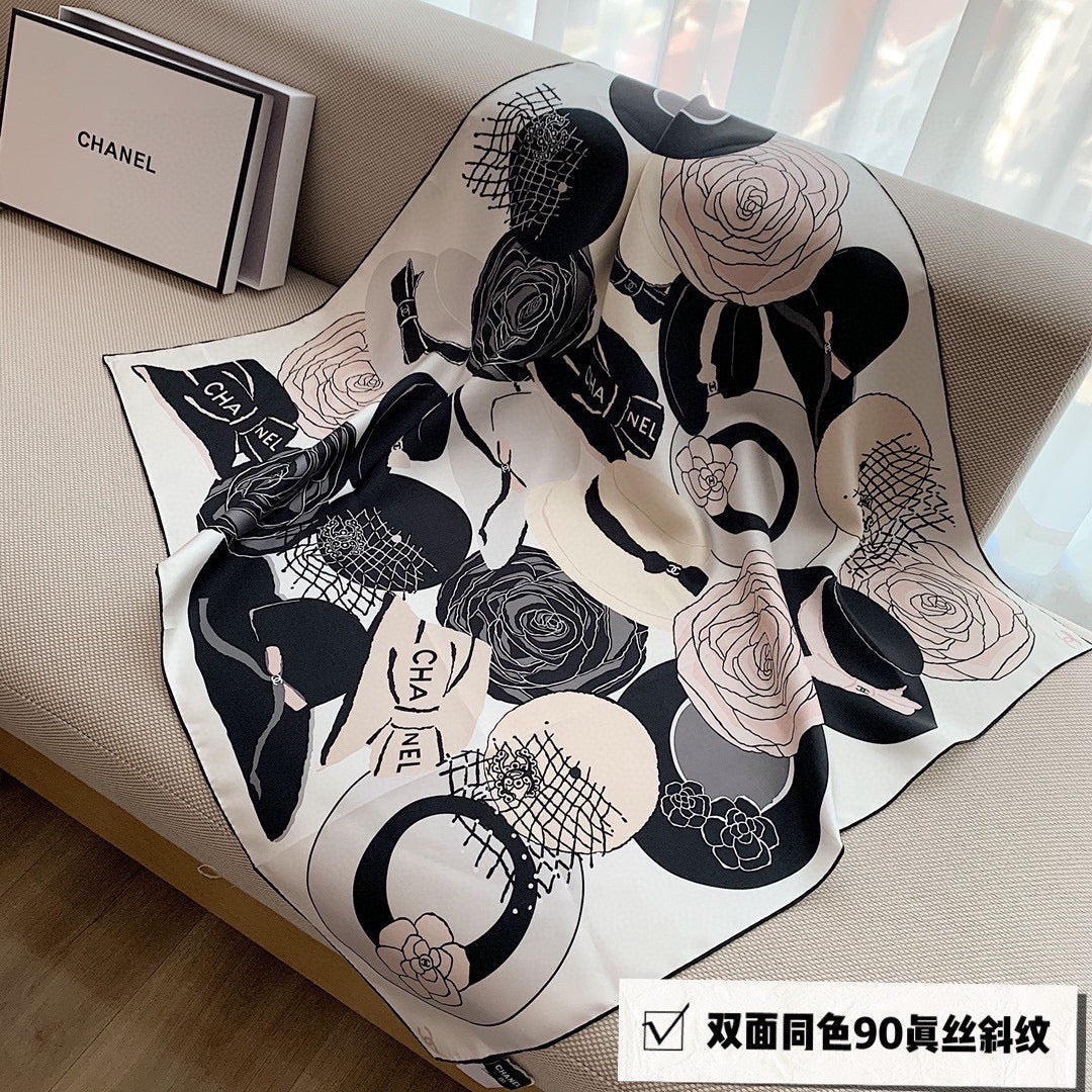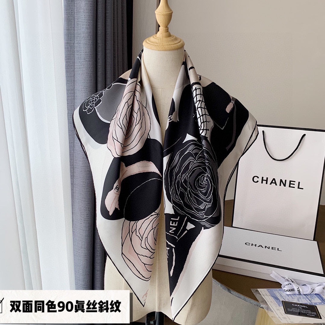 CC Square Scarf 90 CM In White Black Mix Light Beige Silk 288700