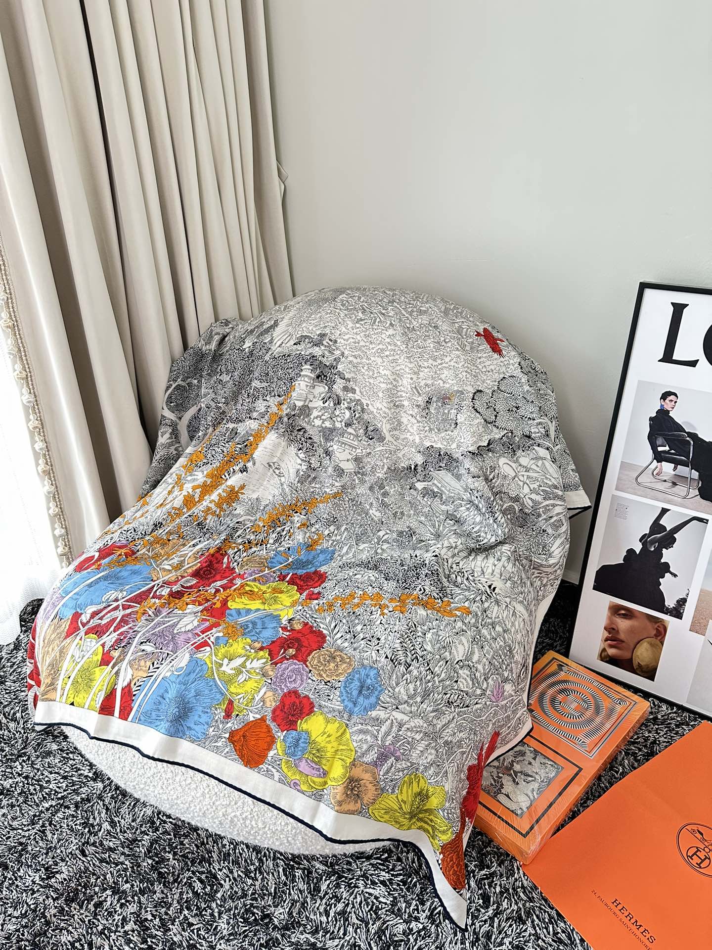 Retour A La Nature Shawl 140 CM White Black Colorful Silk
