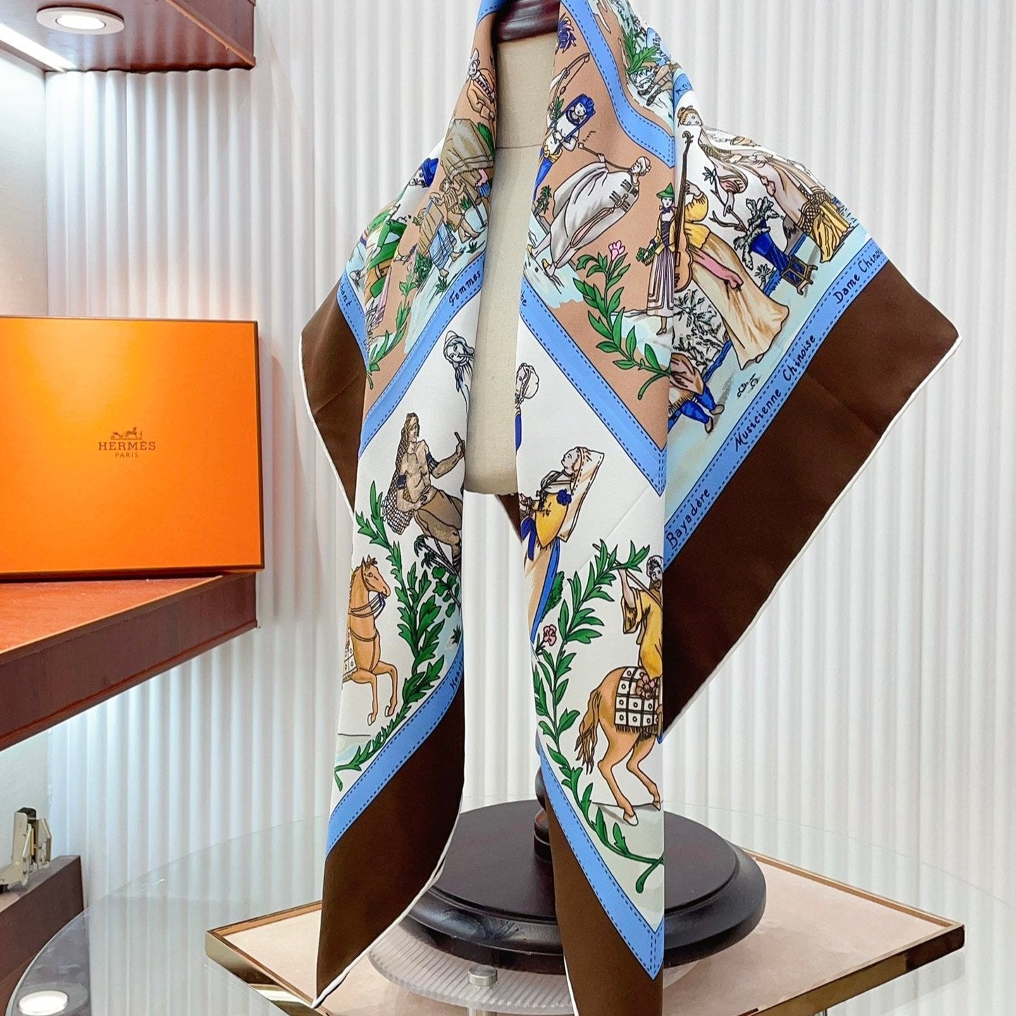 Chevaux Dechaines Shawl 90 CM In White Blue Colorful Silk Twill 201033