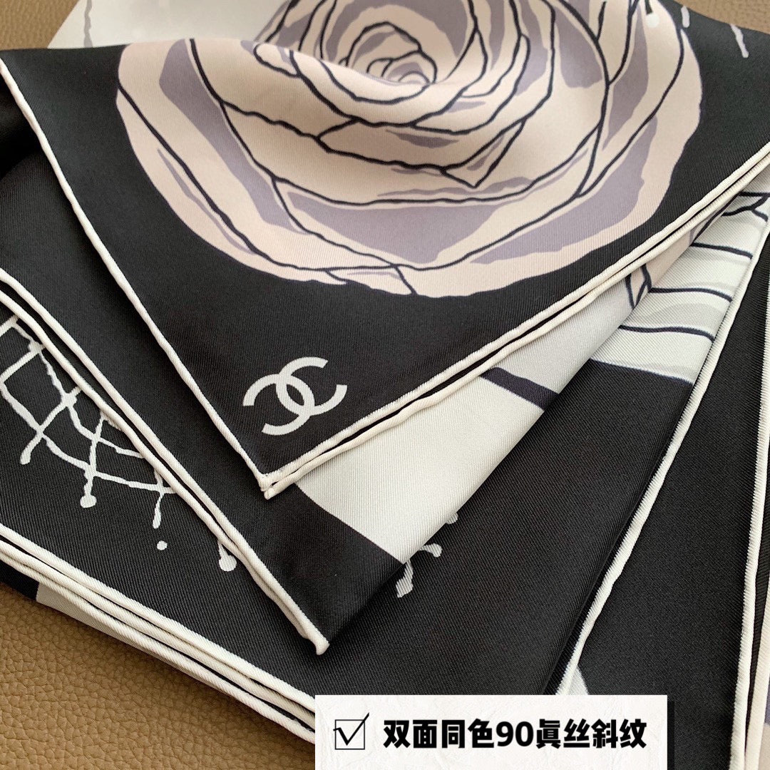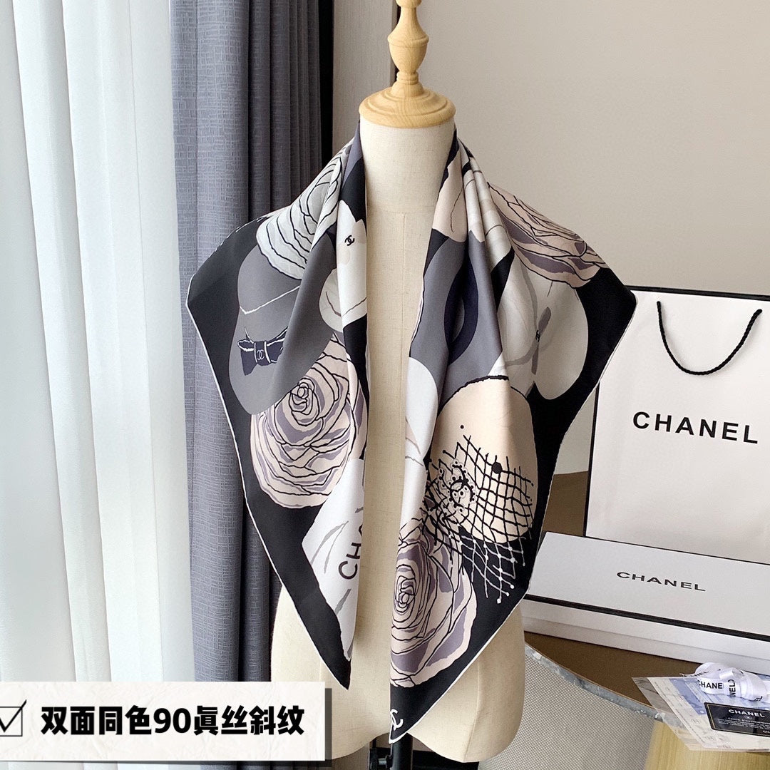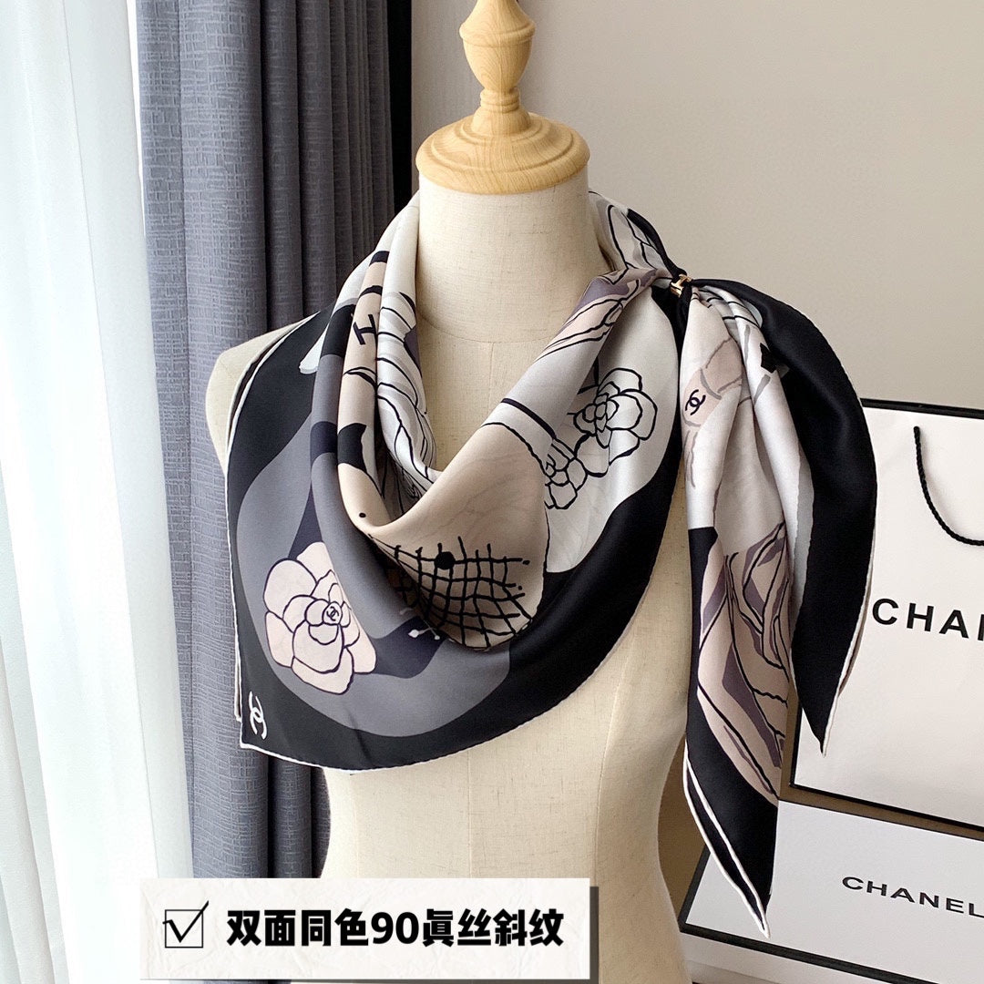 CC Square Scarf 90 CM In Grey Black And White Camellia Logo Print Silk Twill 288739