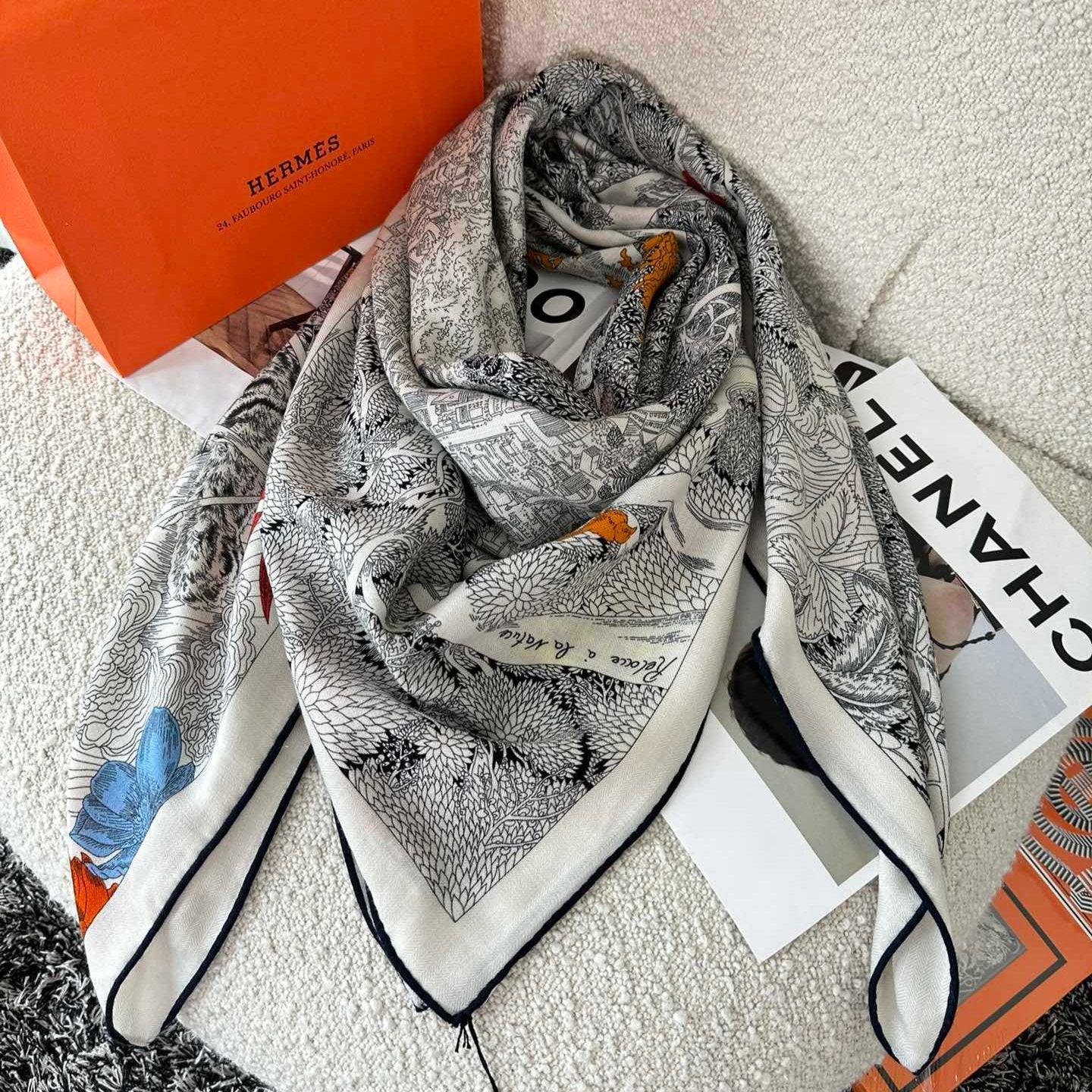 Square Scarf 140 CM Ivory White Pattern Cashmere And Silk